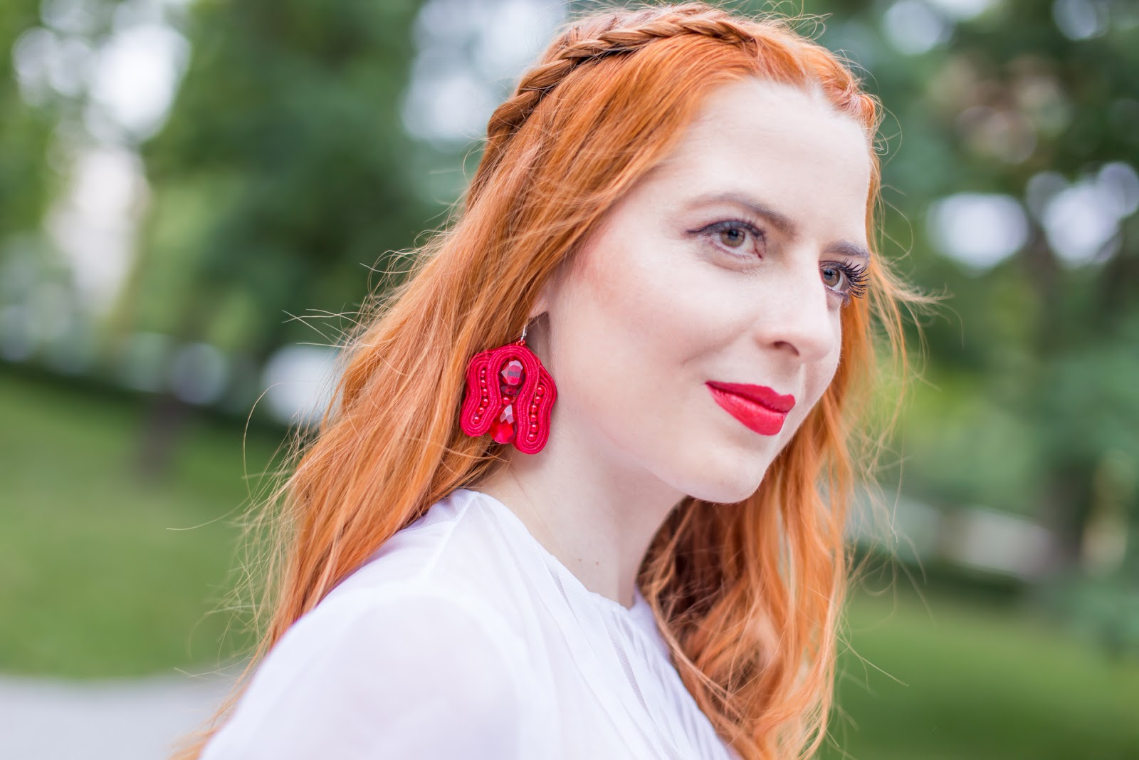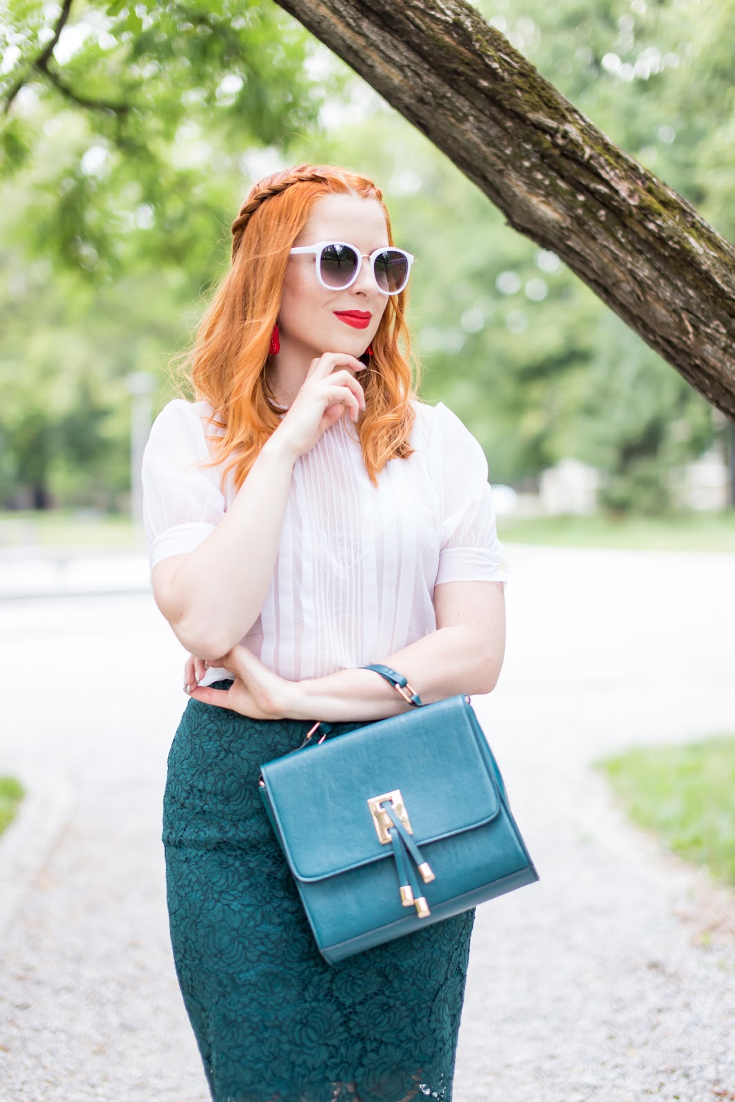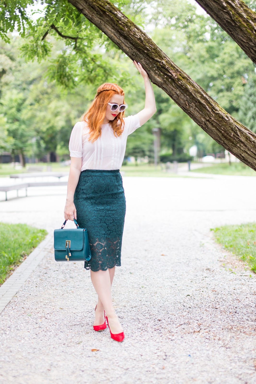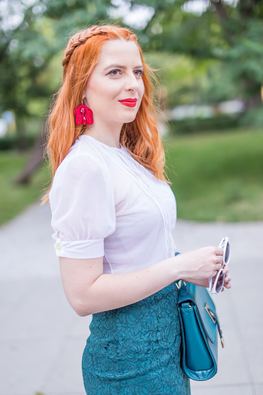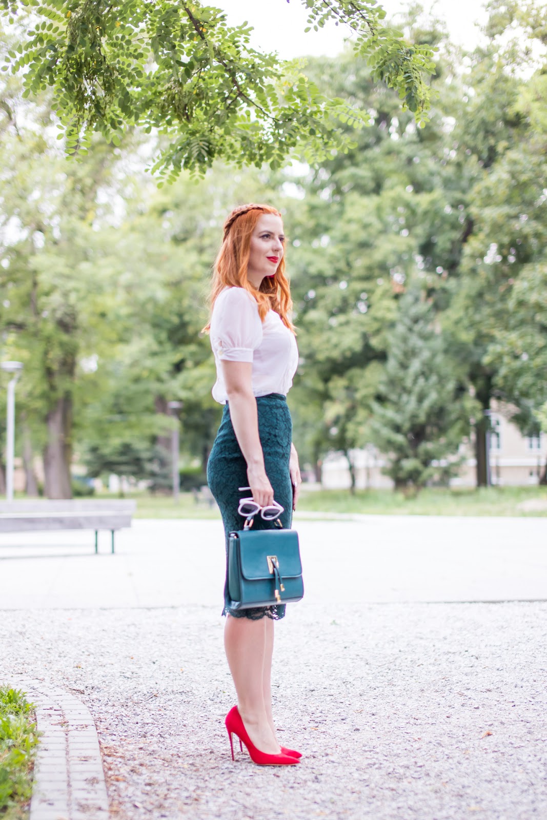 Dnešný post je ešte preddovolenkový. Áno, som tam viac biela ako teraz. Ako sa smejem, po návrate z Kanárskych som už menej belšia. :)) V elegantnom outfite som skombinovala novú sukňu s nádhernou halenkou, ktorú mi venovala Dominikova mamina (za čo jej ešte raz srdečne ďakujem). Nechýbajú červené doplnky v podobe náušníc, nového rúžu a lodičiek. Musím sa priznať, že kombinácia týchto troch farieb v dnešnom looku sa mi veľmi páči. Verím, že inšpiruje aj vás.