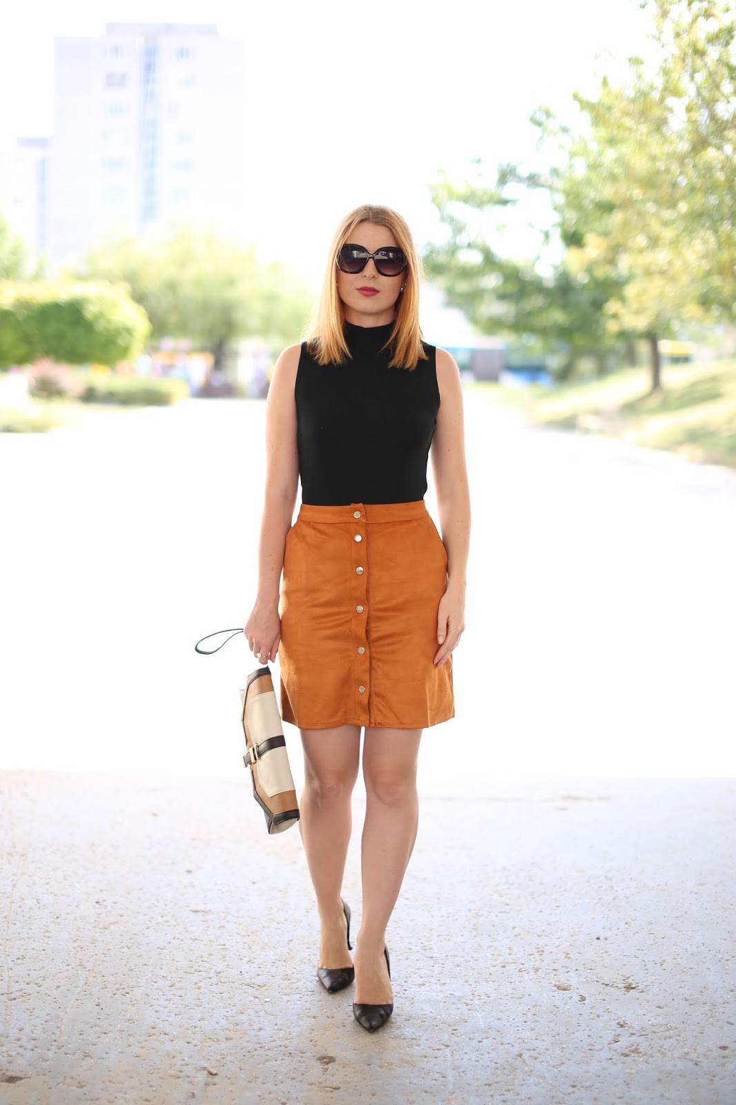 top – SECOND HAND, sukňa – EBAY, okuliare – METAXA, lodičky – F&F, listovka – PRIMARK