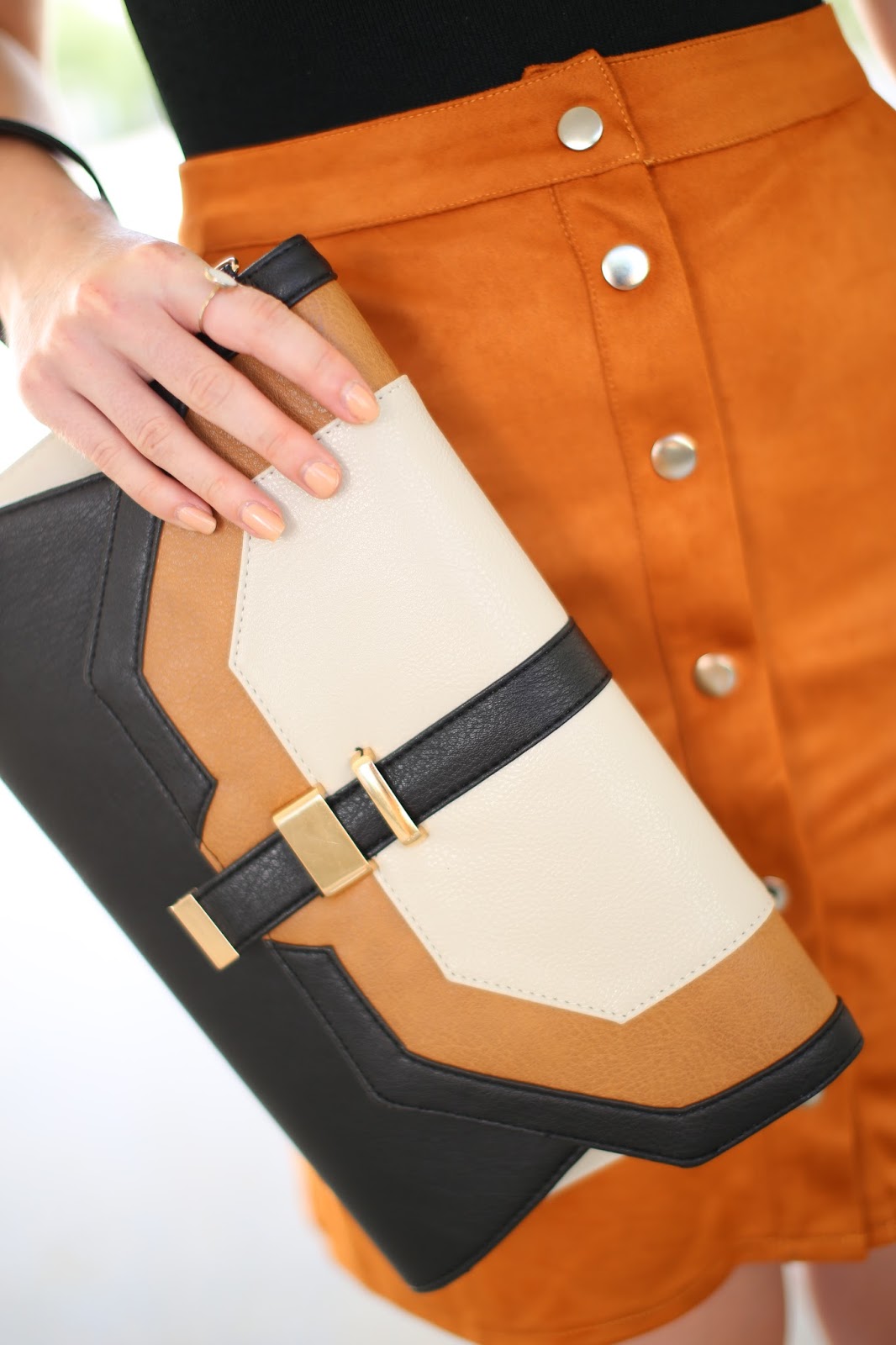 milujem jednotlivé návraty v móde. Najradšej by som vlastnila jednu obrovskú skriňu, kde by som odkladala oblečenie a o niekoľko rokov ho vytiahla opäť s tým, že je znova v kurze. Ak by som ju mala, tak počas uplynulých týždňov by som určite z nej vybrala kúsky s nádychom 70. rokov. Do tých som sa priam zamilovala. Obľúbila som si zvonové flare džínsy, biele halenky s odhalenými ramenami, vzorované košele, strapcové kabelky či semišové sukne. Táto so zapínaním vpredu je moja najobľúbenejšia. Veľmi rada ju kombinujem k bielym blúzkam, obtiahnutým topom, mokasínam, ale aj lodičkám. V tomto outfite som chcela docieliť výsledný elegantný look s čiernym vŕškom, čiernymi lodičkami a listovkou. Okrem tohto kúsku sa počas jesene môžete na blogu tešiť i na ďalšie oblečenie z kategórie Back to the 70s.