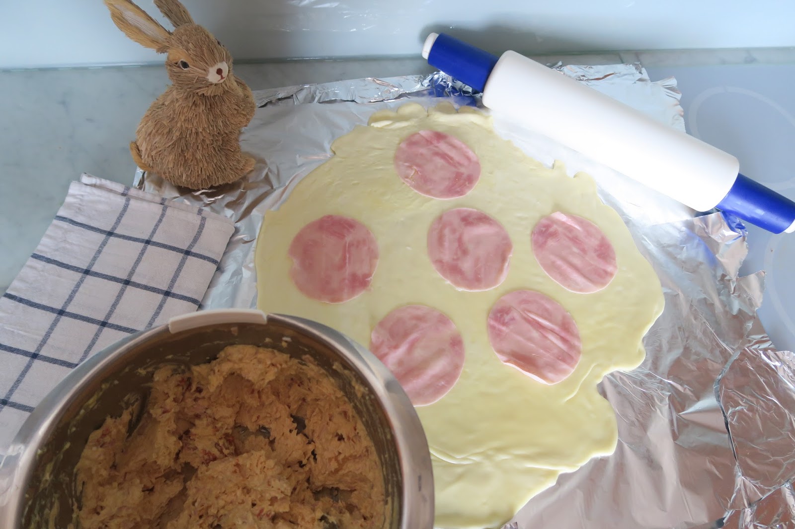 Na vyvaľkané syrové cesto poukladajte plátky šunky. Vždy ich dávam na syr len niekoľko, aby sa vytvoril zaujímavý efekt pri krájaní.