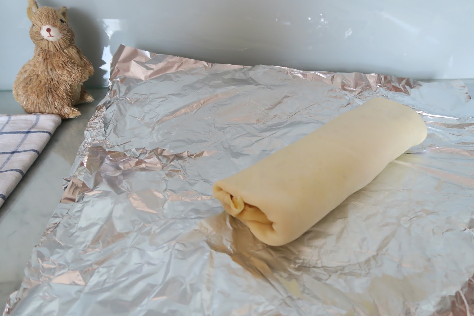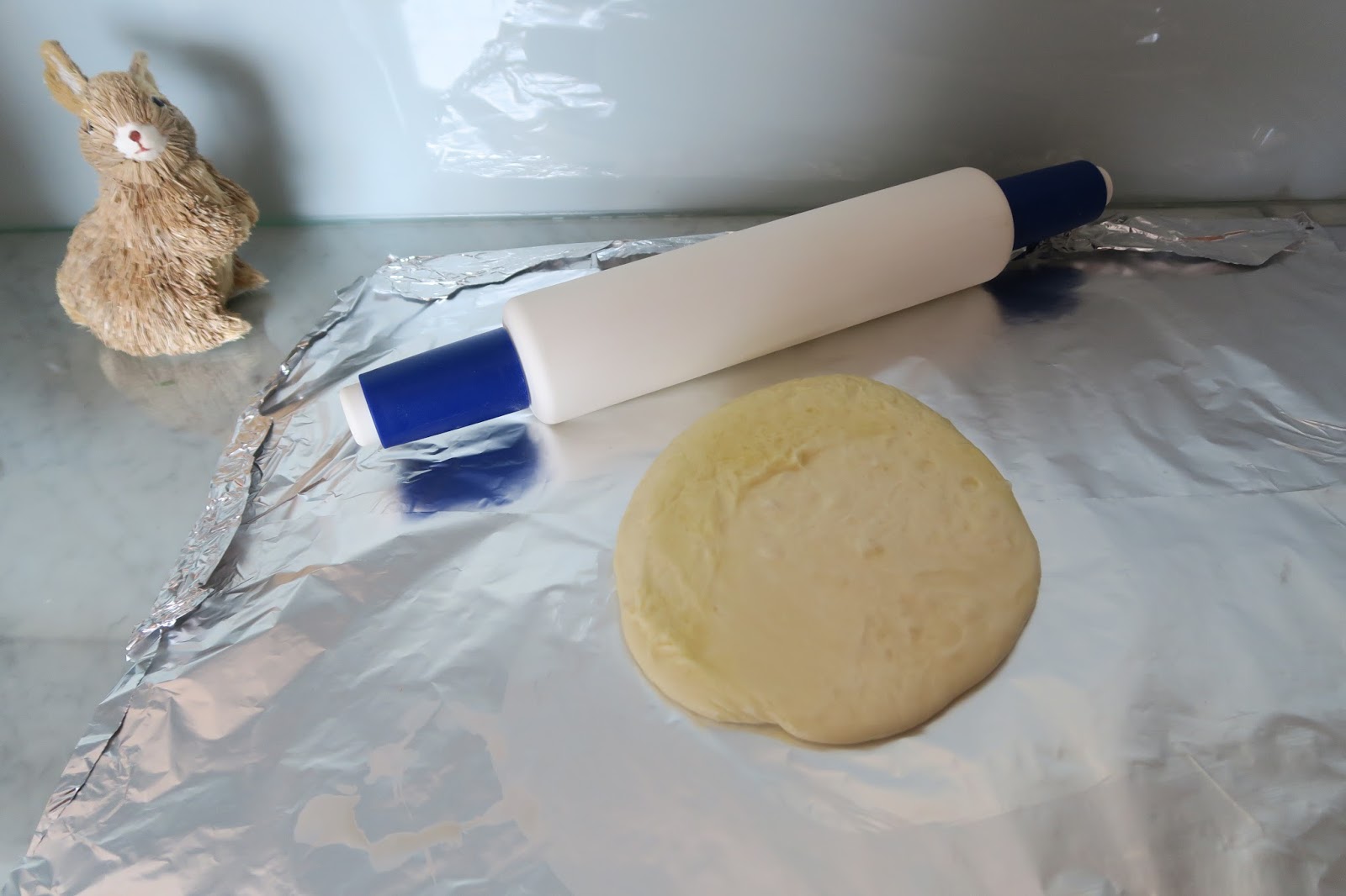 Keď bude syr roztopený, odstráňte sáčky a položte hmotu na alobal. Teraz je potrebné, aby ste všetky kroky vykonávali čo najrýchlejšie, keďže syr veľmi rýchlo tuhne. Vyvaľkajte ho, aby vzniklo tenké cesto.