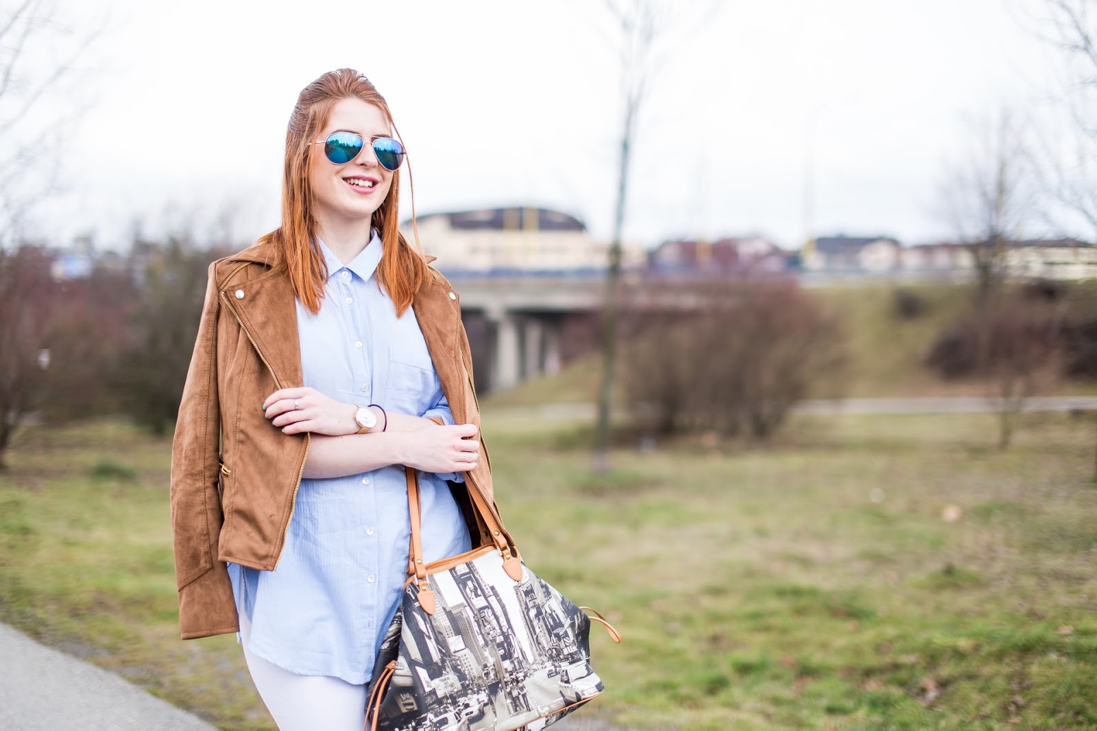 V dnešnom poste si môžete vychutnať moju novú bundičku, ktorú som si zamilovala. Pochádza z aktuálnej kolekcie v F&F a je dokonca aj v nádhernej modrej farbe. Aj ostatné kúsky, ako nohavice a belasá košeľa je tejto značky. Veľmi sa mi páči kombinácia škoricovej s bielou či belasou, preto som ich spojila v dnešnom outfite.