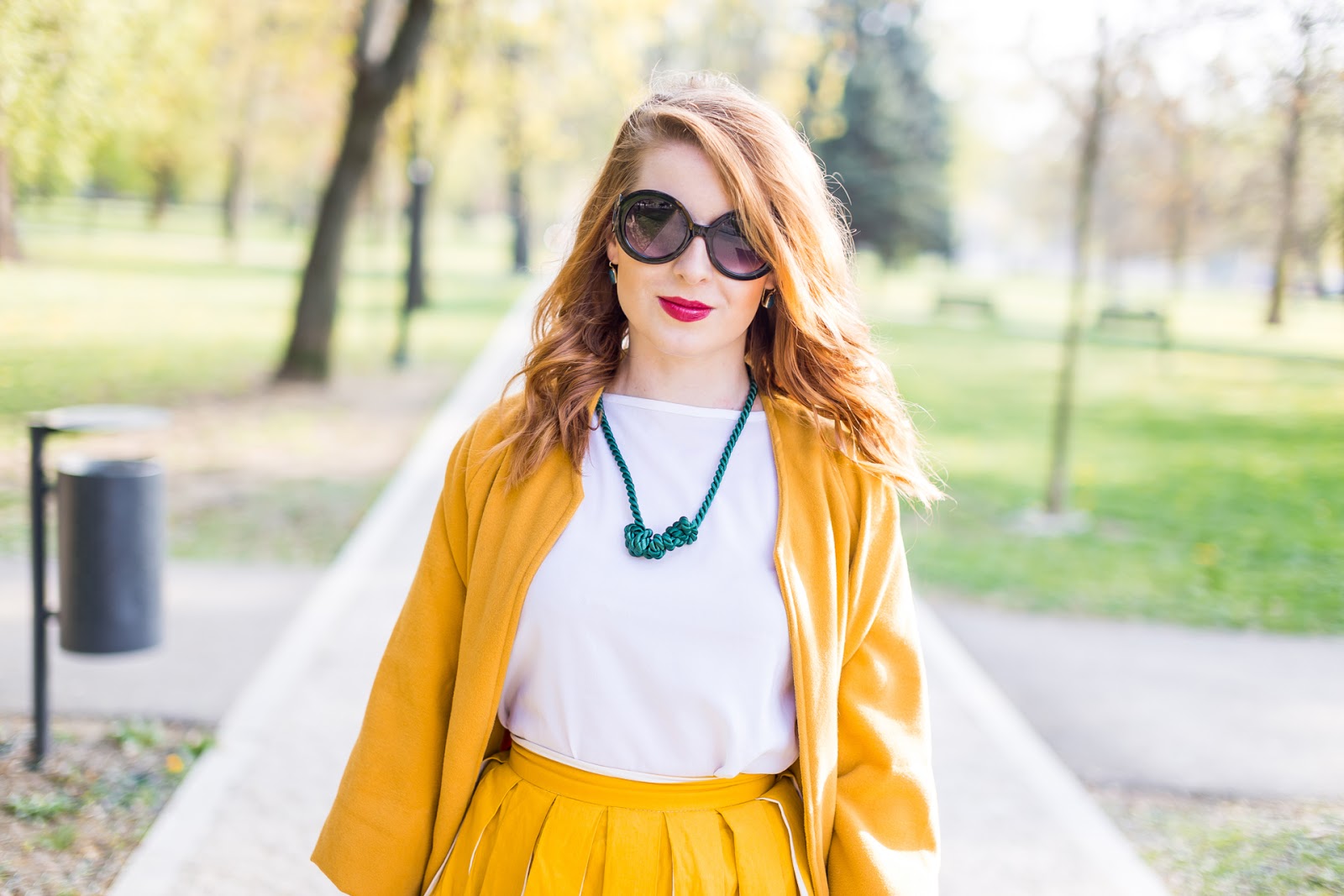 Ak by ste si chceli privolať pozitívnu náladu, rozhodne odporúčam farby. Do širokej palety pestrých odtieňov som sa v týchto dňoch priam zamilovala. V dnešnom outfite som skombinovala žltú s bielou farbou a k tomu zelené doplnky. Záverečnú bodku v celom stylingu dal červený rúž. Žltý kabátik mám vo svojom šatníku už viac ako pol roka a veľmi rada ho nosím k čiernej (tu si však dávam veľký pozor, aby som náhodou nevyzerala ako hmyz), sivej, bielej, zelenej či modrej.