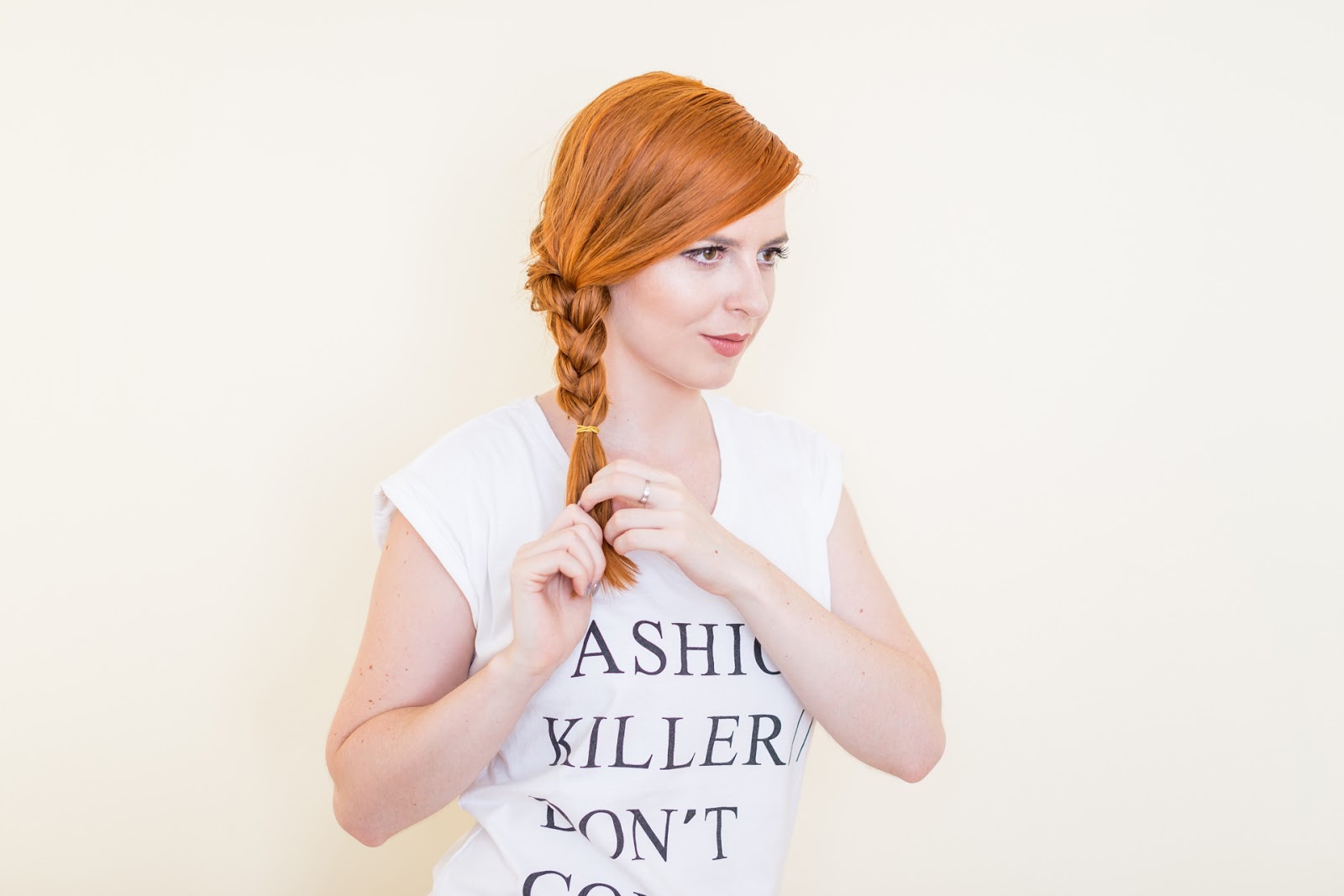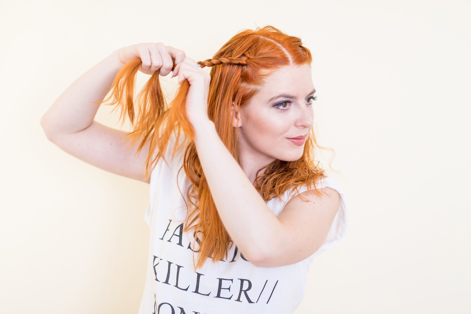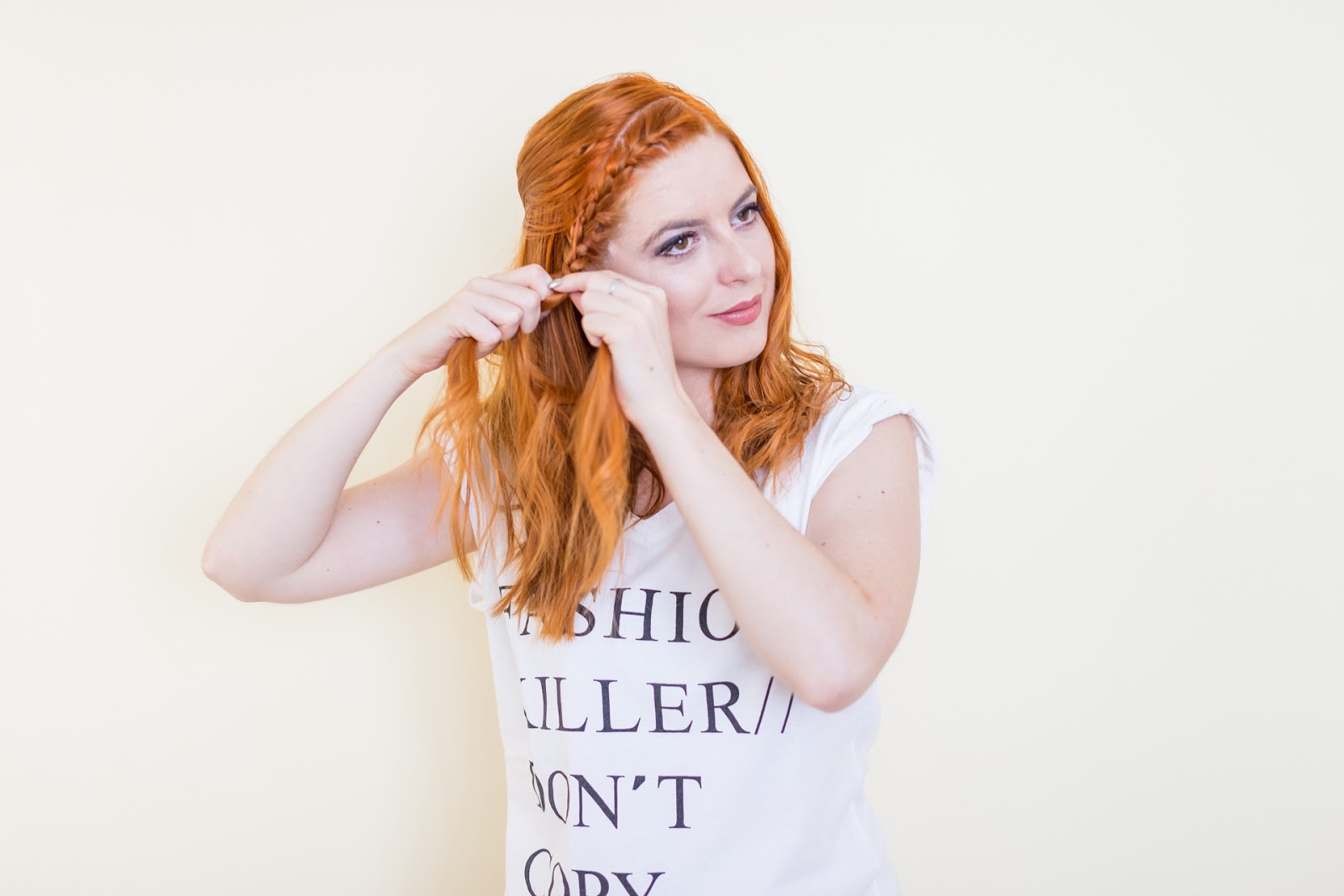 Celú časť vlasov som si zobrala na jednu strana a začala klasickým spôsobom zapletať vlasy.