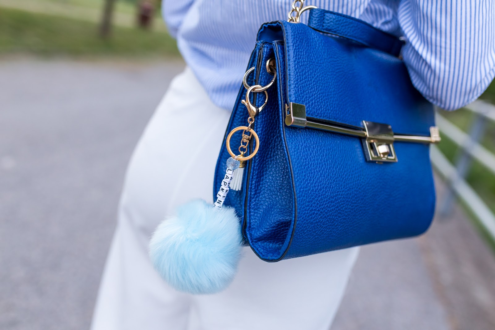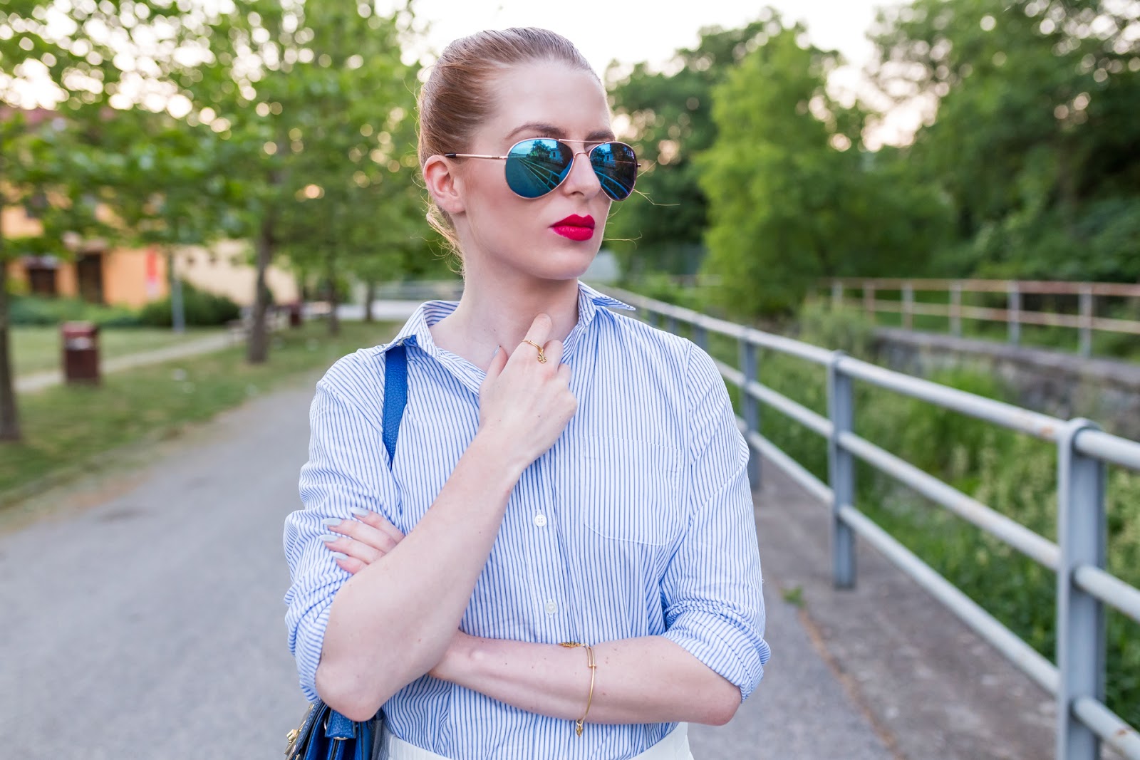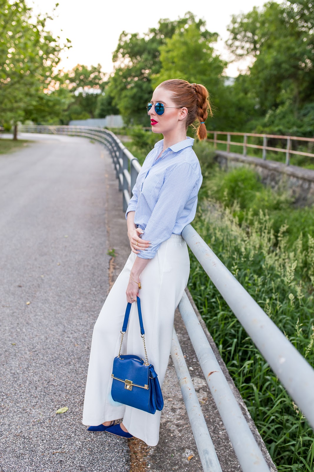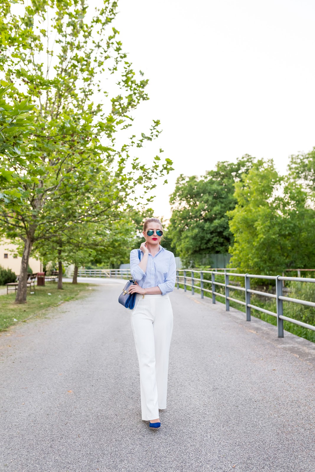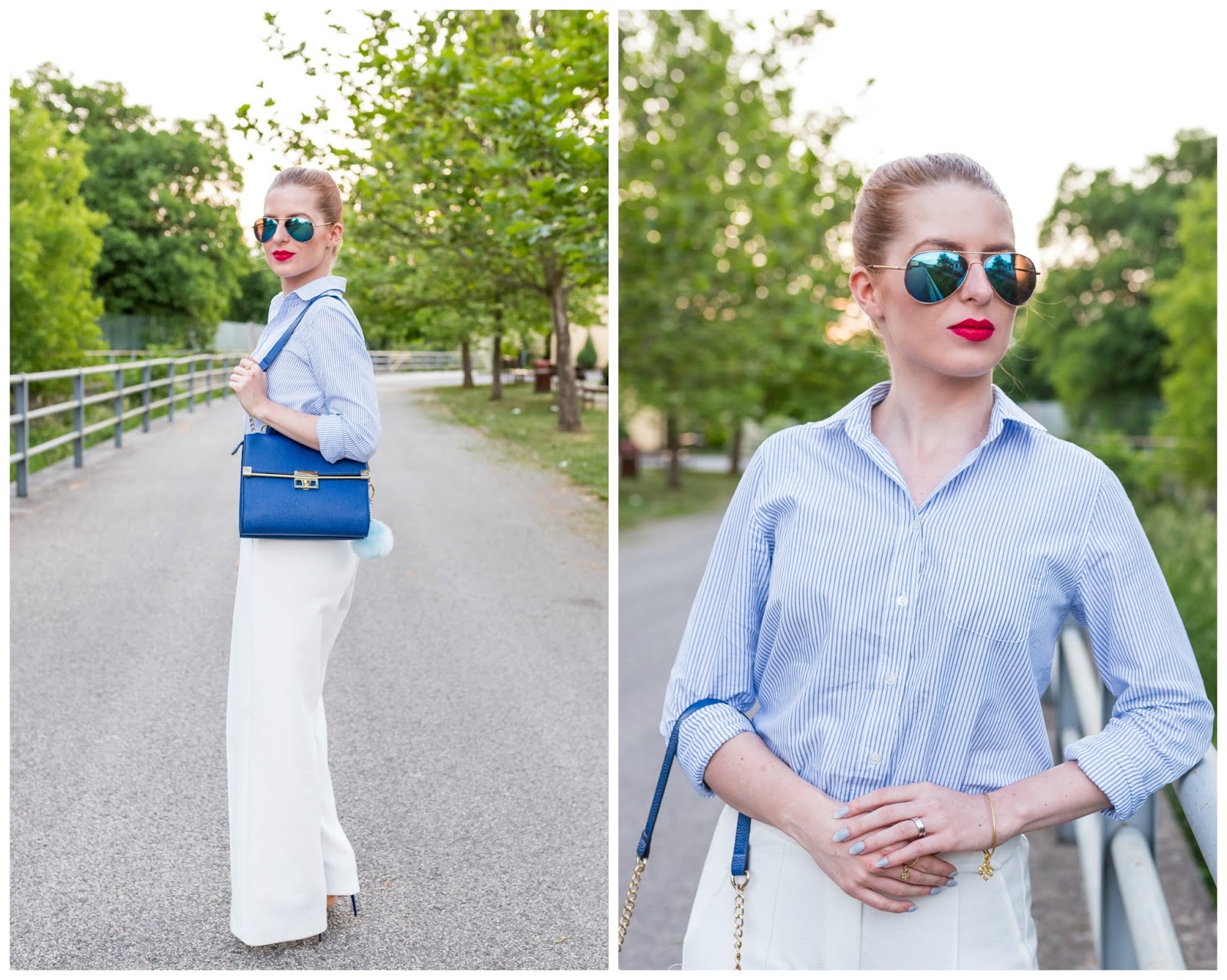 Základom dnešného outfitu, v ktorom podľa odhadu spomínaného chalana, vyzerám na menej ako osemnásť, sú palazzo nohavice. Tento typ oblečenia mám veľmi rada, pretože je pre mňa zo všetkých strihov najpríjemnejší a najkomfortnejší. Najradšej ich kombinujem s obtiahnutými vrchnými časťami odevu, celými plavkami či košeľami ako v tomto prípade. Na leto sú skrátka pre mňa ideálnym spoločníkom, pretože sú vzdušné a veľmi pohodlné. Košeľa je jedným z mojich najaktuálnejších prírastkov do šatníka. Teším sa, že som konečne našla moju vysnívanú, ktorá sa skvele hodí k elegantnému looku ale aj k ležérnemu outfitu. Táto je značky GANT a mám ju z košického obchodu Zipizappe. Zvyšné doplnky sú v tmavomodrej farbe a so zlatými detailmi podobne ako náramok a prsteň Chrysalis Karma z Blogerinas.