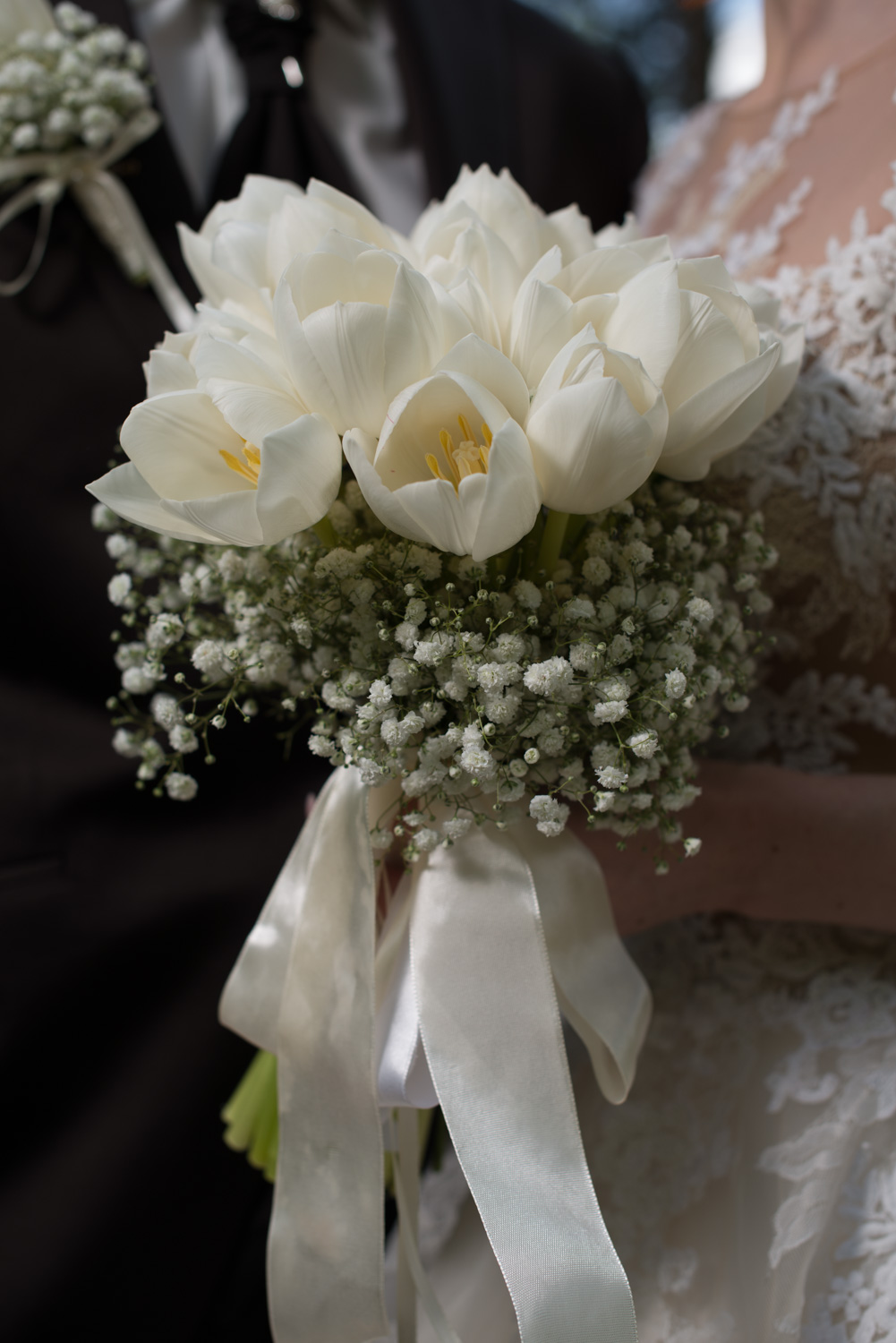 Moja predstava o kytici a pierku bola po výbere svadobných šiat hneď jasná. Musia byť minimalistické a mali by obsahovať len biele tulipány a gypsomilky. Vďaka Galérii kvetín sa mi splnila ďalšia vytúžená predstava. Musím sa priznať, že som sa trochu bála prepravy kytice a pierka z Bratislavy do Košíc, kde sme mali svadbu, ale moje obavy boli neopodstatnené. Obe záležitosti dorazili čerstvé a vydržali ešte niekoľko dní po svadbe. Krásu kytice som si užila len do približne 23. hodiny, pretože potom sa z nej vytešovala Monika, ktorá ju spomedzi ďalších „výdajchtivých“ neviest chytila pri tradičnom hádzaní.