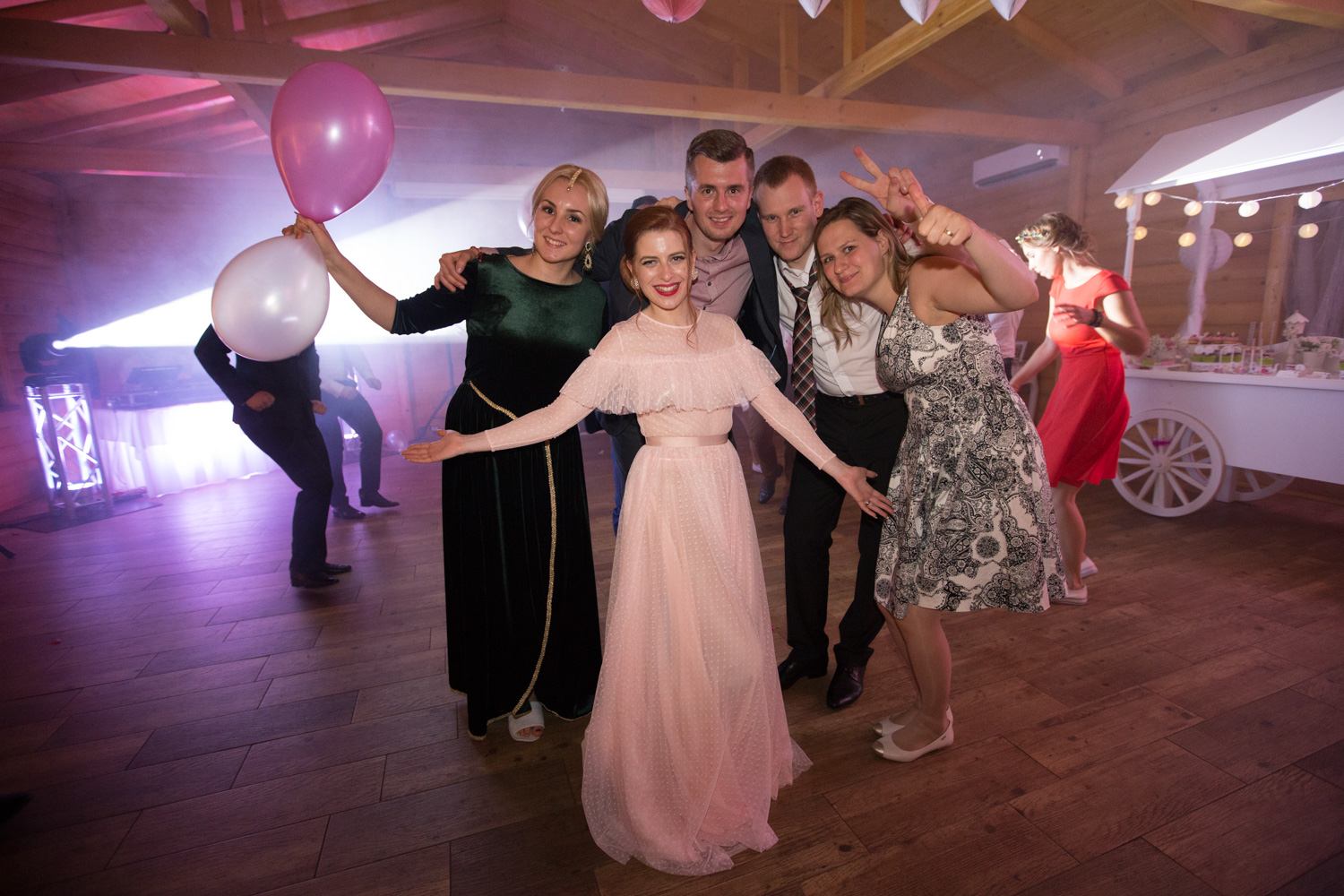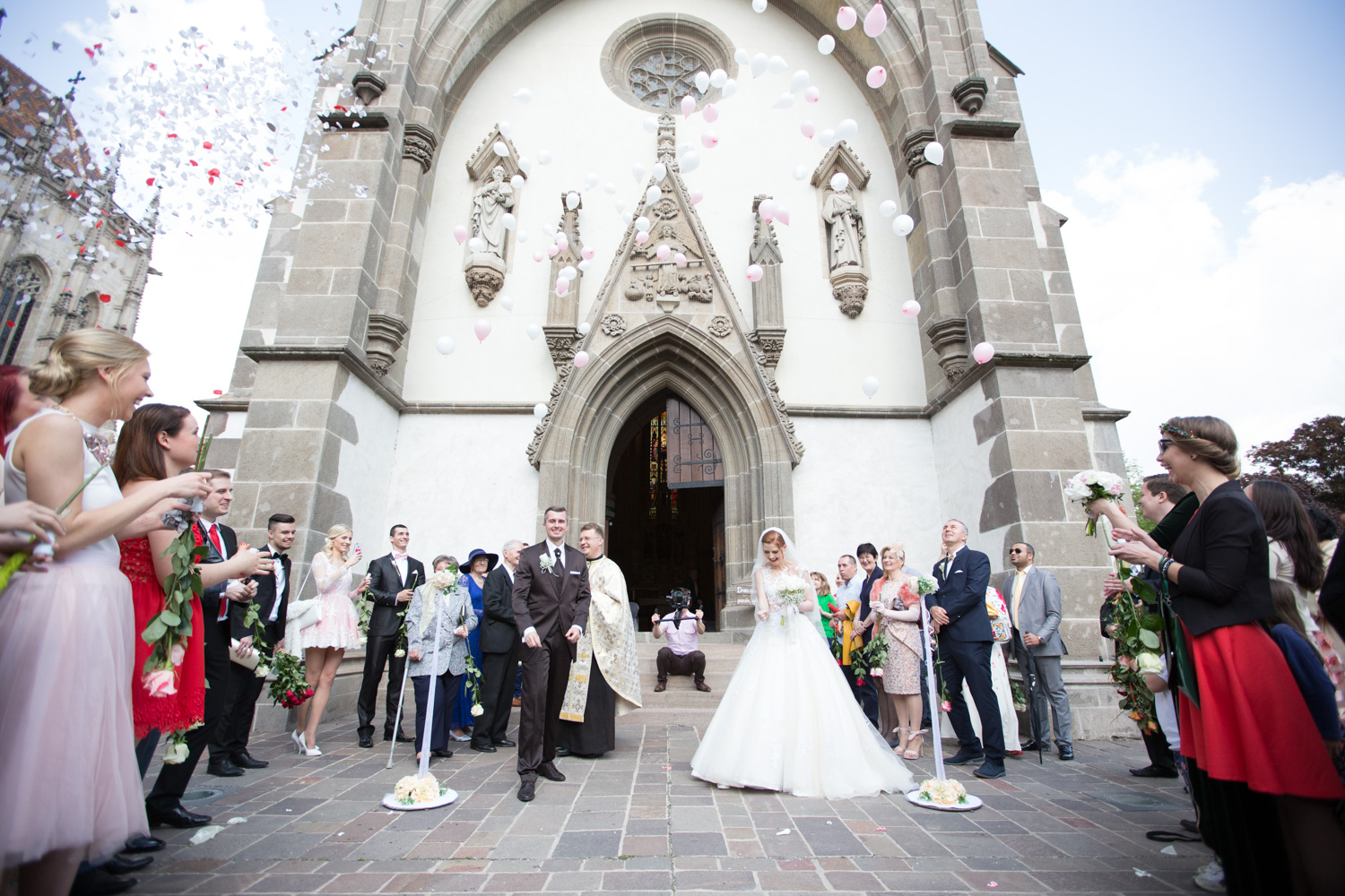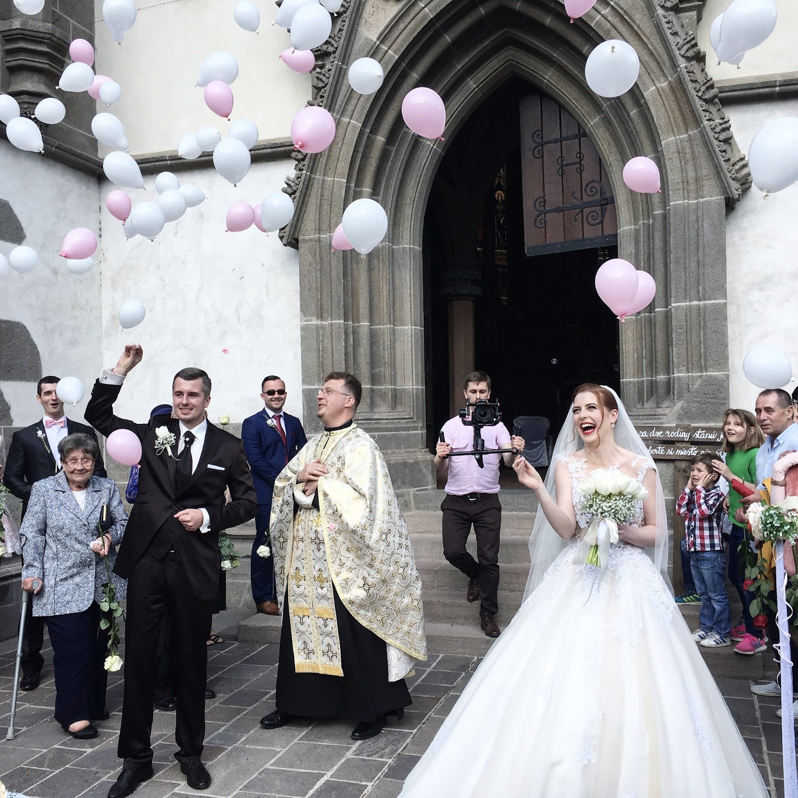 Keď sme vychádzali po obrade z kaplnky, vonku nás čakali ozdobené stojany s dvoma obrovskými balónmi naplnenými ďalšími balónikmi. Srdiečkovými špendlíkmi sme tie najväčšie praskli a do vzduchu vyletel veľký bielo – ružový balónový „oblak“ spolu s množstvom konfiet. Bol to neskutočne nádherný moment, ku ktorému sa pri spomienkach väčšina hostí vracia. Okrem toho sme balónovú výzdobu plánovali aj do bazéna, kde mali byť umiestnené svietiace balóniky. Avšak majitelia Koliby Zlatá podkova (mali sme tu svadobnú hostinu a ubytovanie) nám to v deň svadby nedovolili, čo nás veľmi nahnevalo a zamrzelo. Nakoniec sme však balóny preniesli dovnútra a svadobní hostia sa s nimi zabávali až do rána.