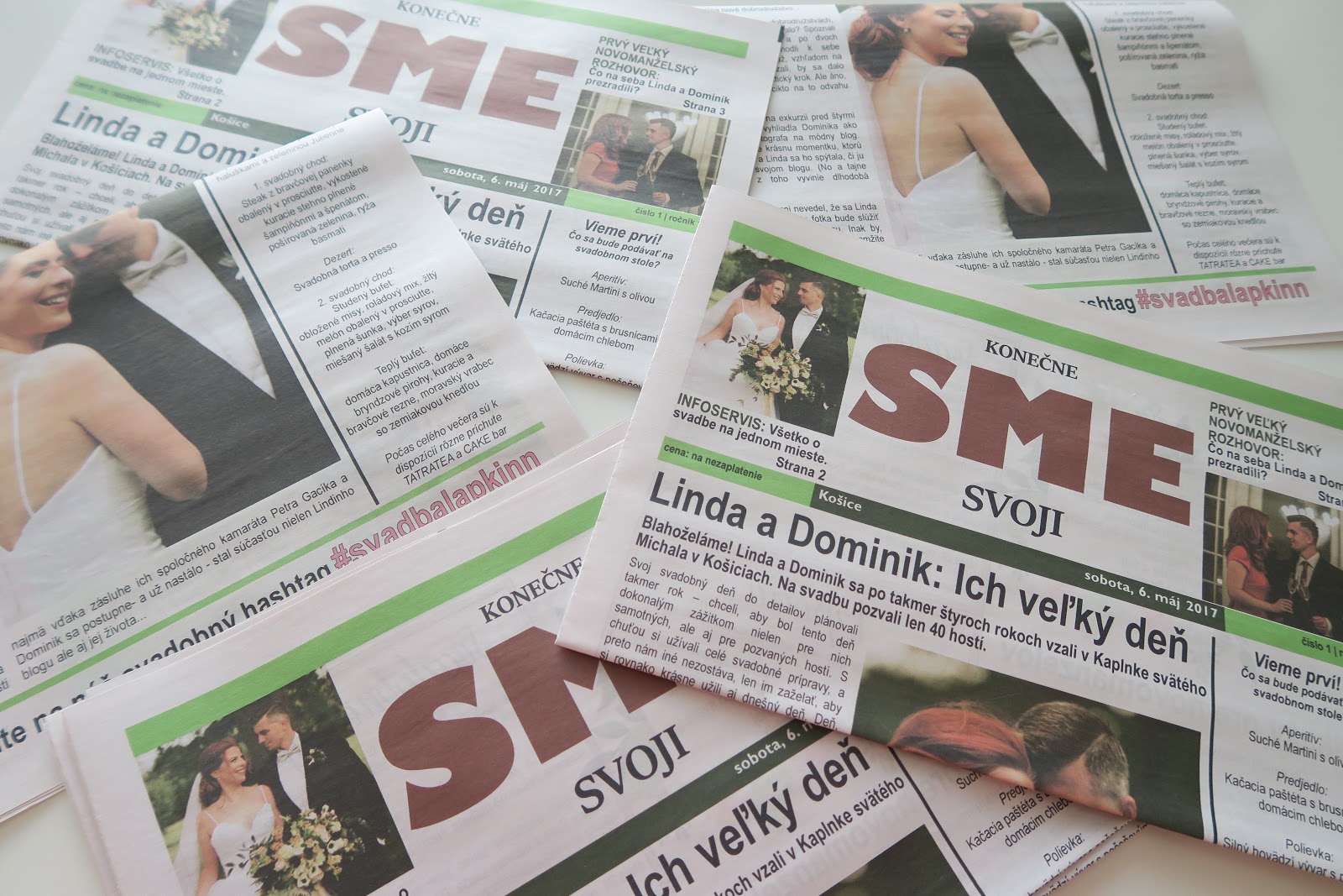 Som veľmi šťastná, že som Paulínu zo Svadobných novín našla na Sashe. Okamžite som jej písala, že si chceme u nej objednať tieto originálne noviny v štýle SME. V svadobných tlačovinách čakali hostí všetky dôležité informácie k svadbe, rozhovory s mladomanželmi, blahoželania či ankety. Jednu časť novín sme rozdali pred kaplnkou, ďalšia časť čakala na hostí počas svadobnej hostiny. Mnohí sa dodnes na niektorých odpovediach zabávajú či si nás doberajú.