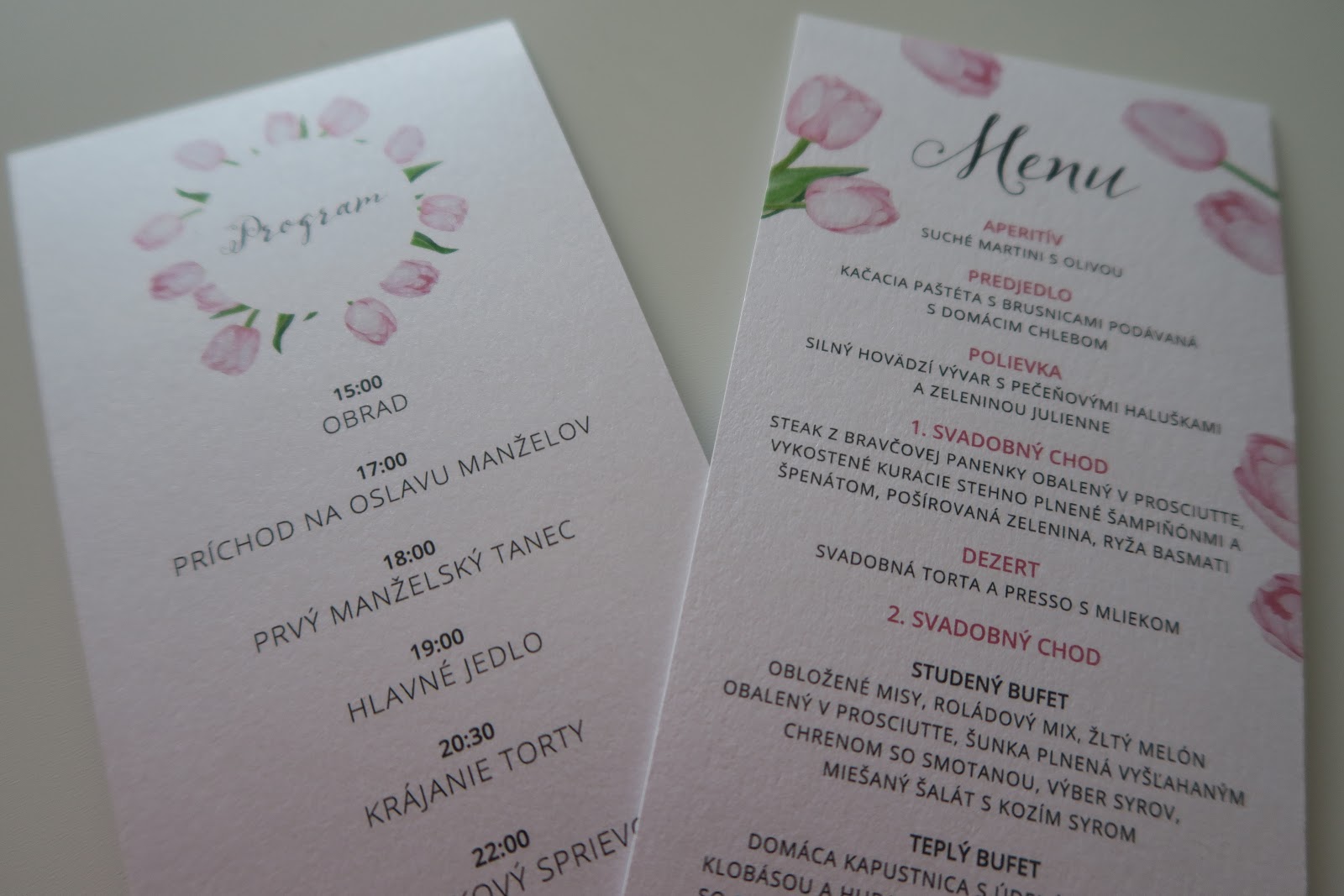 Nielen svadobné oznámenia a pozvánky sme zverili do rúk Sisy, ale aj ďalšie tlačoviny v rámci svadby. Zo stránky SISINE.SK sme si vybrali menovky, program a menu. Všetko bolo navrhnuté na mieru s našimi obľúbenými tulipánmi a vytlačené na kvalitný papier vďaka chalanom z VACHPRINT. Musím sa priznať, že táto spolupráca mi urobila veľkú radosť. Veľmi si vážim a oceňujem Sisinu promptnú komunikáciu, trpezlivosť a talent.