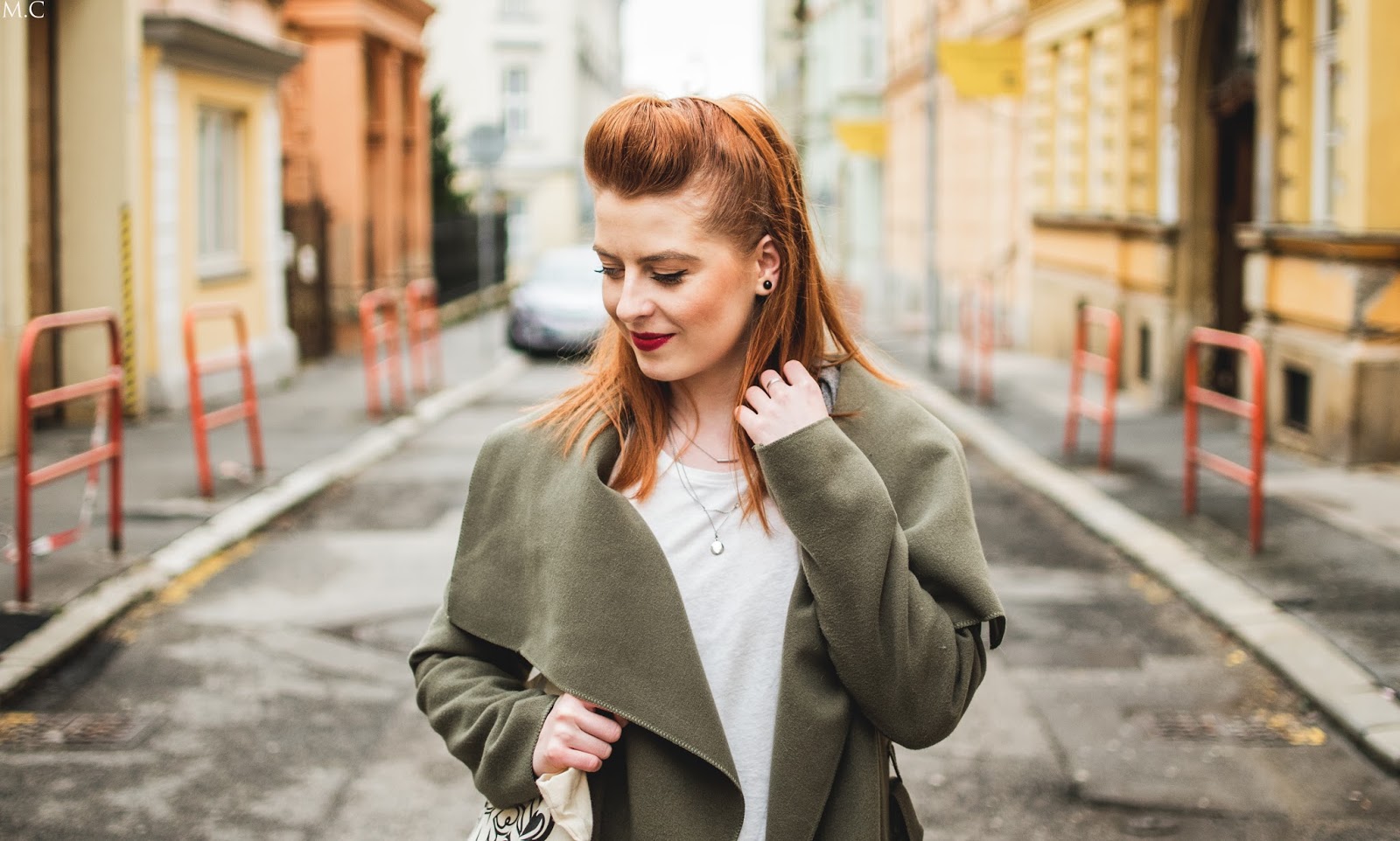 kabát – LUXURY MALL SLOVAKIA, nohavice – PRIMARK, tričko – LINDEX, tenisky – ASOS, sveter – SECOND HAND, náušnice – KLENOTY AURUM, náhrdelníky – H&M, taška – KERE
