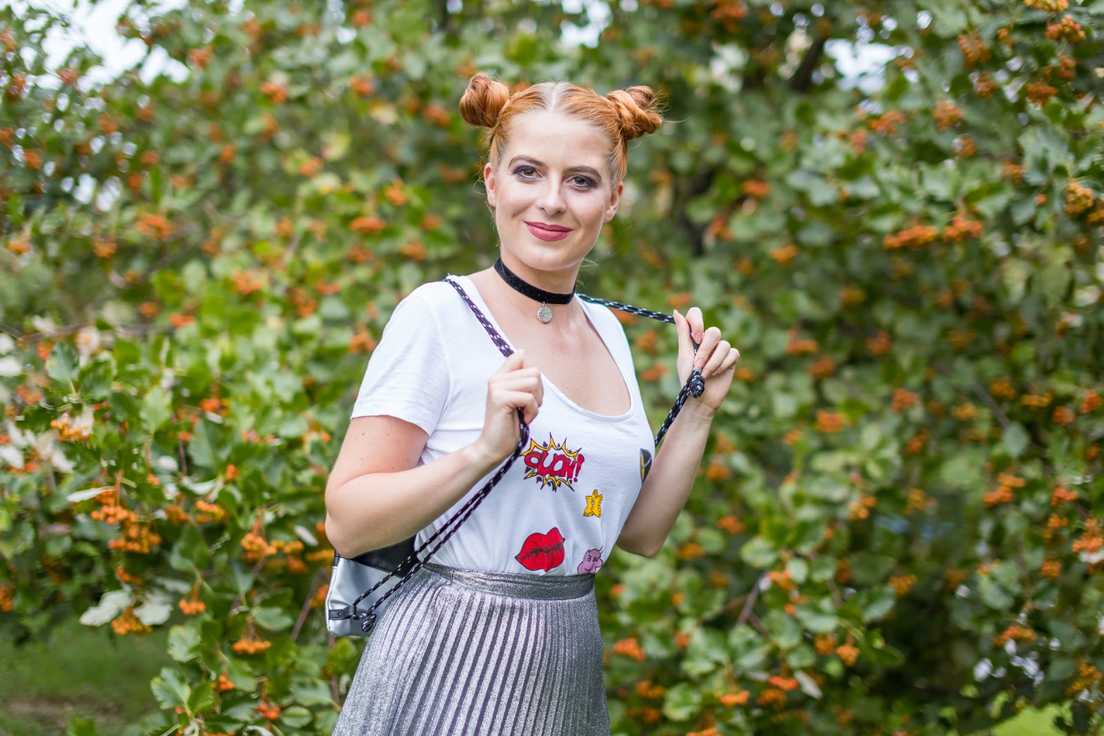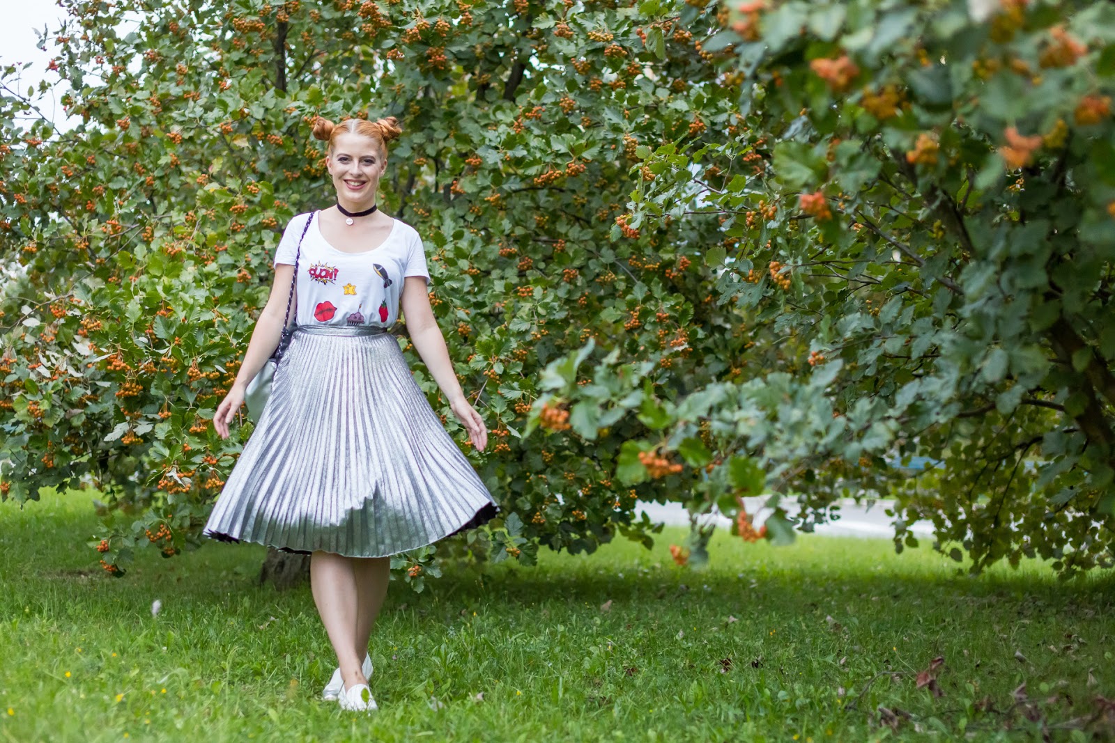 Keď som sa pri pohľade na všetky plagáty hlásajúce návraty do školských lavíc zamyslela nad tým, čo sa v súčasnosti nosí v prvý deň na základnej či strednej škole, napadlo mi hneď niekoľko alternatív. Dokonca aj Dominik ich mal hneď niekoľko. Jedna z nich sa týkala outfitu so sukňou, bielou košeľou a okuliarmi, ktorá sa v jeho fantázií skôr približovala k sexy uniforme neposlušnej školáčky. Kombináciu sukne s blúzkou som si ako prvú predstavila aj ja. Len skôr v elegantnom prevedení. No, potom som si povedala, že pre vás pripravím skôr hravú a sviežu inšpiráciu v štýle BACK TO SCHOOL, ktorá bude zahŕňať hneď niekoľko módnych vychytávok. Nakoniec som svoj školácky outfit vyskladala z týchto aktuálnych trendov – plisovanej sukne v metalickom odtieni, chokera, trička s potlačou pripomínajúcou nášivky a praktického vaku (všetko zo ZOOTu), ktorý je v kurze už nejakú tú sezónu. Celý look som ešte doplnila o dva drdoly, slip ony a okuliare so zrkadlovými sklami.