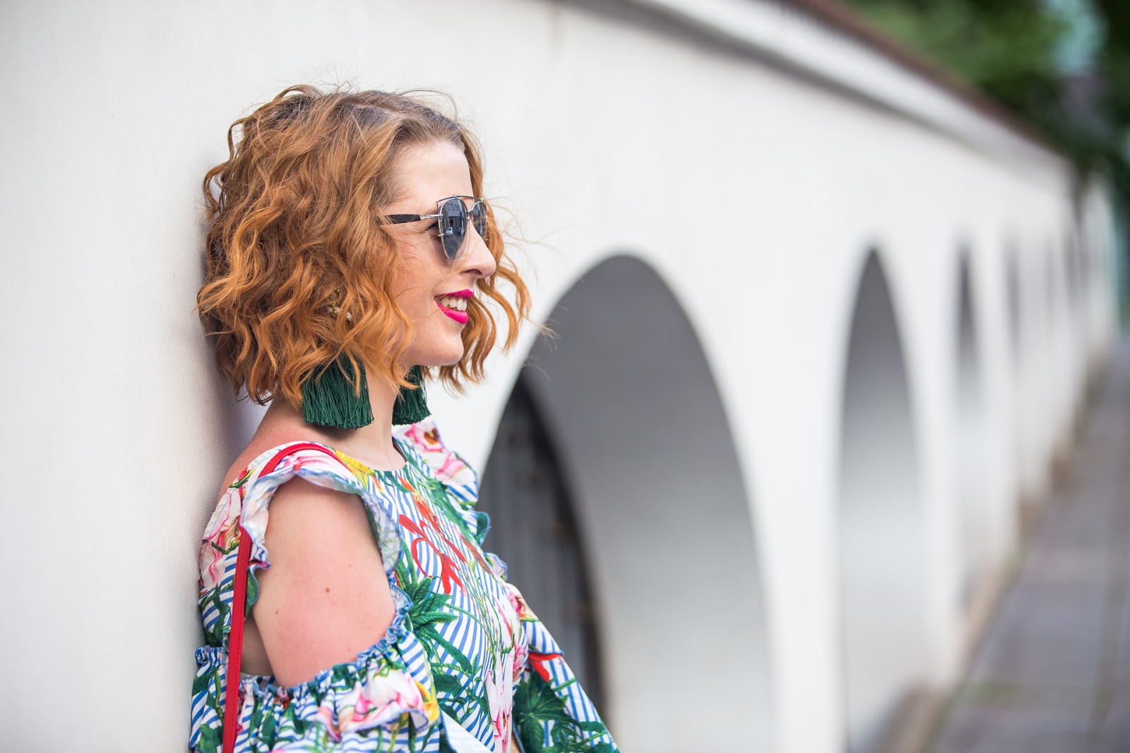Každopádne, nezostáva mi nič iné, iba nosiť dokonca leta tieto super šaty, ktoré schovajú moje nevydarené opálenie. Na tieto letné dni sú priam ideálne. U mňa spĺňajú všetky predpoklady ideálneho kúsku pre leto 2017 – vzdušné, voľné, ľahučké, pohodlné, kvetinové, pásikavé a volánové. Ich výhodou je aj fakt, že sa dajú nosiť obrátene – teda časť na chrbte sa šikovne dá prevrátiť dopredu a vytvoriť tak nový strihovo zaujímavý kúsok. Aktuálne ich nosím v rôznych variáciách, čo sa odvíja od samotnej príležitosti. Keď ma čaká náročnejší deň, počas ktorého potrebujem mať stopercentné pohodlie, volím k nim tenisky. Ak idem len do mesta na kávu či do obchodu, ideálne sú pre mňa sandále na rovnej podrážke. A počas dní, kedy mám chuť „byť na vysokej nohe“, je voľba presne tá istá ako na dnešných záberoch – malá červená kabelka, lodičky a výrazné náušnice. Mimochodom, Tanečnice (presne tak ich totiž autorka pomenovala a ani sa jej nečudujem, keďže skutočne pripomínajú tanečníčky s obrovskou sukňou) sú od šikovnej Dominiky Gulden som si počas leta zamilovala. Mohli ste ich vidieť vo viacerých letných outfitoch (napríklad TU, aj TU, i TU). V predchádzajúcich lookoch som zvolila skôr kratšie, no musím sa priznať, že tieto dlhé sa mi páčia úplne najviac, hlavne k mojej aktuálnej dĺžke vlasov.