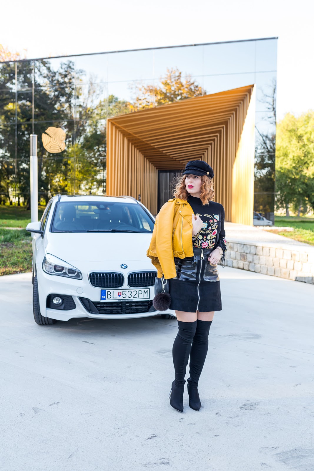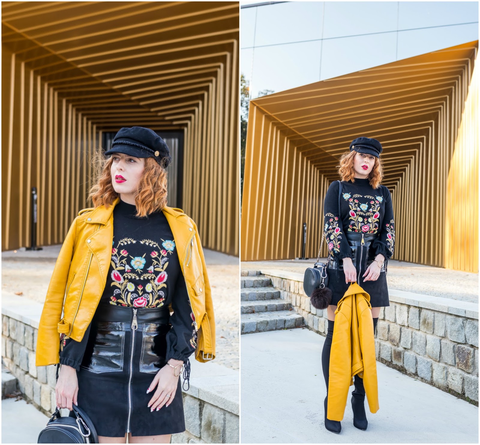 Čierny sveter s výšivkami je pokračovaním môjho výšivkového obdobia z minulého roka. Milujem jeho vzory a zároveň zaujímavo riešené rukávy. K nemu som zvolila čiernu áčkovú sukňu s vysokým pásom a čižmy nad koleno (opätky majú dokonalé a relatívne pohodlné). Nechýba ani čiapka, ktorá sa počas tohtoročnej jesene stala u mňa plnohodnotnou náhradou klobúkov.