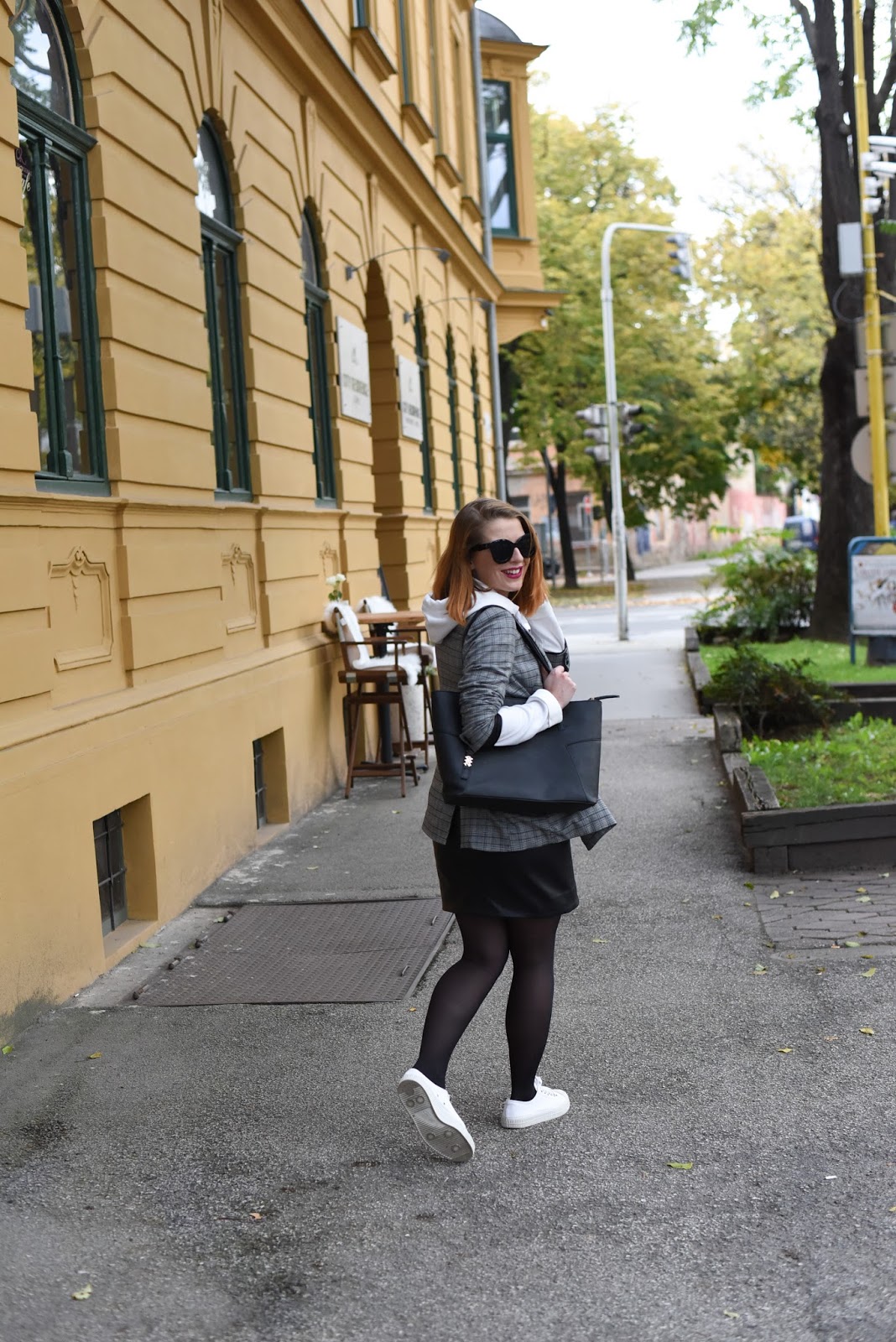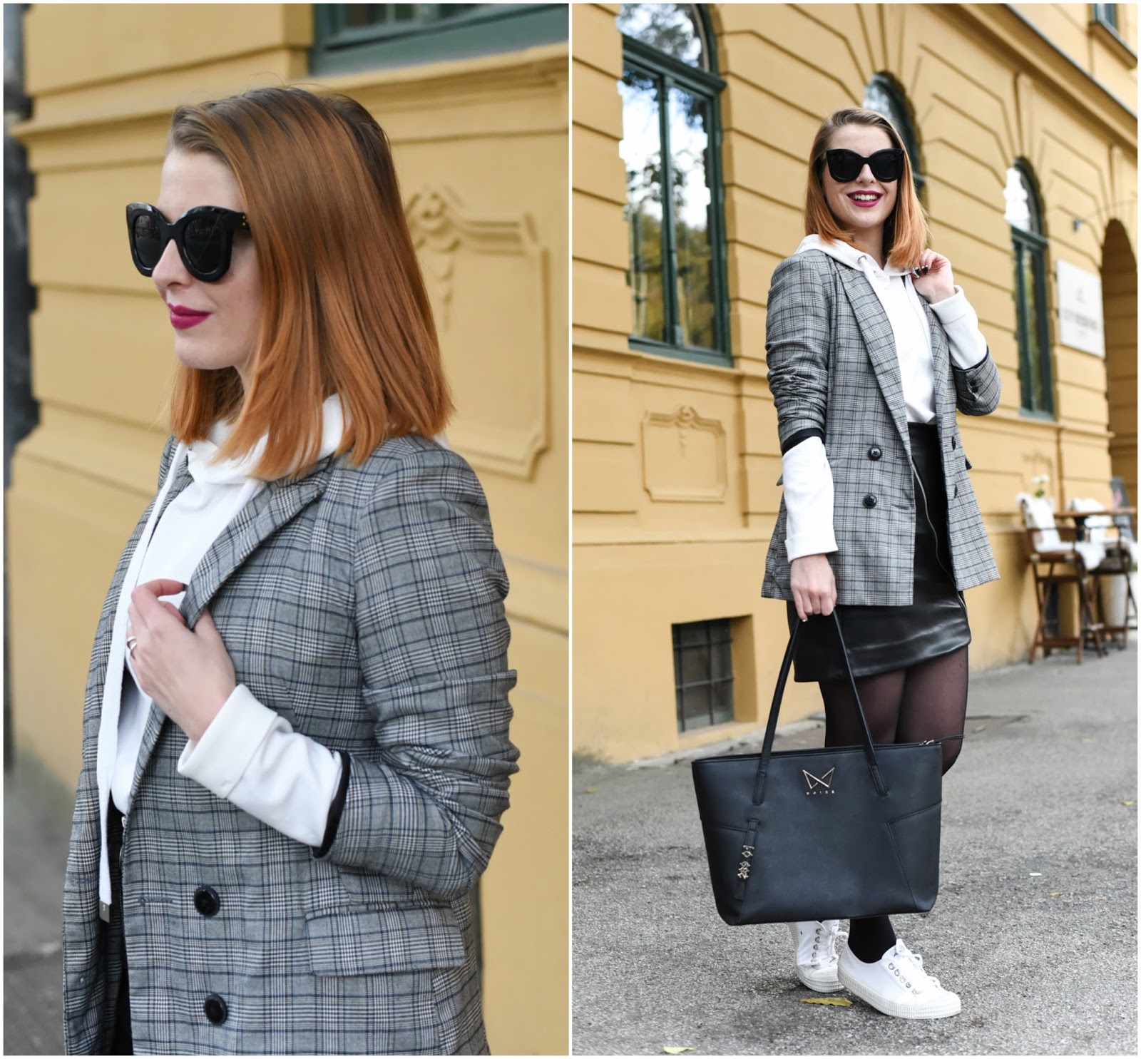 Kárované sako považujem za môj aktuálne najobľúbenejší kúsok a zároveň veľmi variabilný. S obľubou ho nosím k jednoduchým bielym tričkám, košeliam, šatám alebo džínsom. Samozrejme, skvele sa kombinuje aj k ležérnejším mikinám podobne ako v dnešnom outfite. Doladila som k nemu ešte biele tenisky, čiernu koženkovú sukňu a veľká kabelka, kam napchám hocikedy všetko potrebné. Takto sa cítim najlepšie. Priznávam sa, že v posledných dňoch mi ležérnejšie outfity vyhovujú úplne najviac.