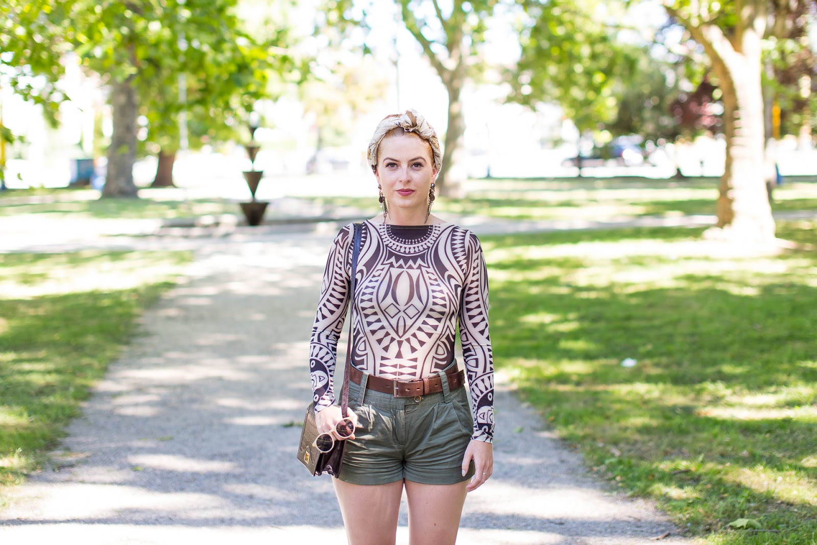 Hneď, ako som si ho rozbalila, mi bolo jasné k čomu ho doladím. Zvolila som šortky s vyšším pásom v army farbe, k tomu šatku v podobnej farbe ako body a pohodlné sandálky. Jednoducho, uvoľnený letný až dovolenkový outfit v etno štýle.