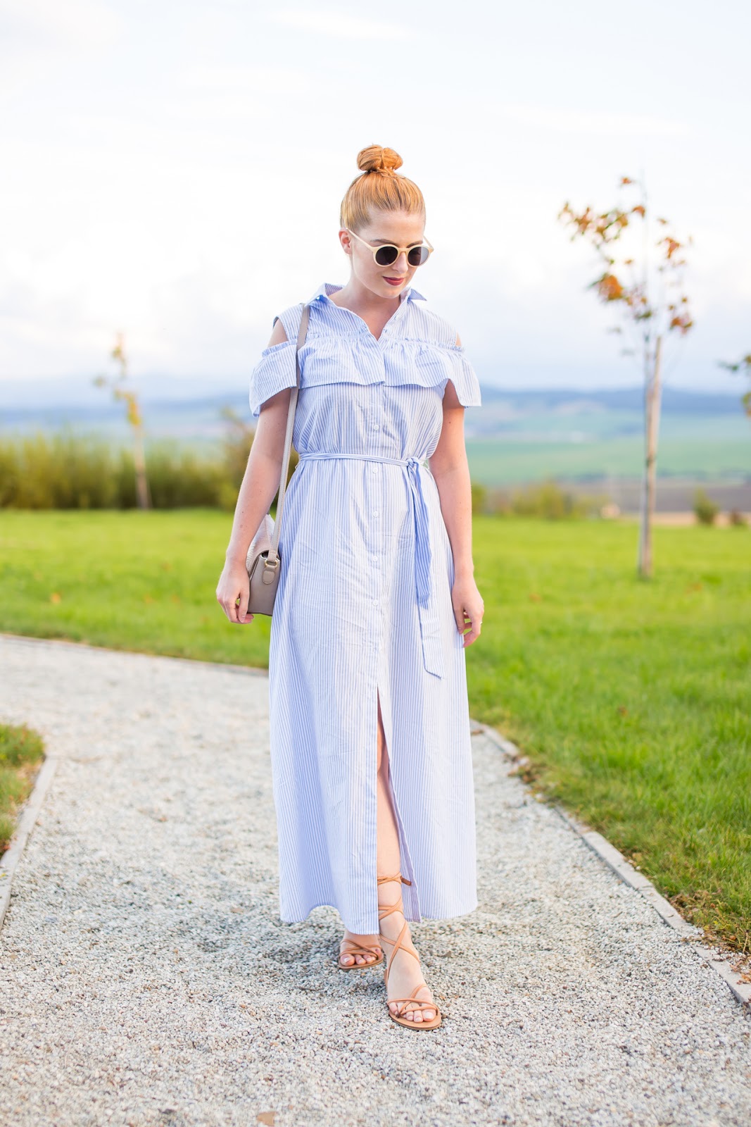 napriek predchádzajúcemu článku určenému najmä pre inšpiráciu počas chladnejších jesenných dní som si pre vás na blogu pripravila ešte niekoľko letnejších outfitov. Tento je maximálnym zosobnením môjho tohtoročného leta. Obsahuje totiž veľa volánov, šnúrovacie sandálky, šaty, malú kabelku, slnečné okuliare a vypnuté vlasy. Jednoducho, prvky, s ktorými som si najčastejšie užívala letné dni a ktoré som si zamilovala. Hlavne pásikavé šaty sú pre mňa láskou na prvý, druhý, tretí a myslím, že aj na stý pohľad. Hneď, ako som ich uvidela na stránke, som vedela, že ich musím mať.
