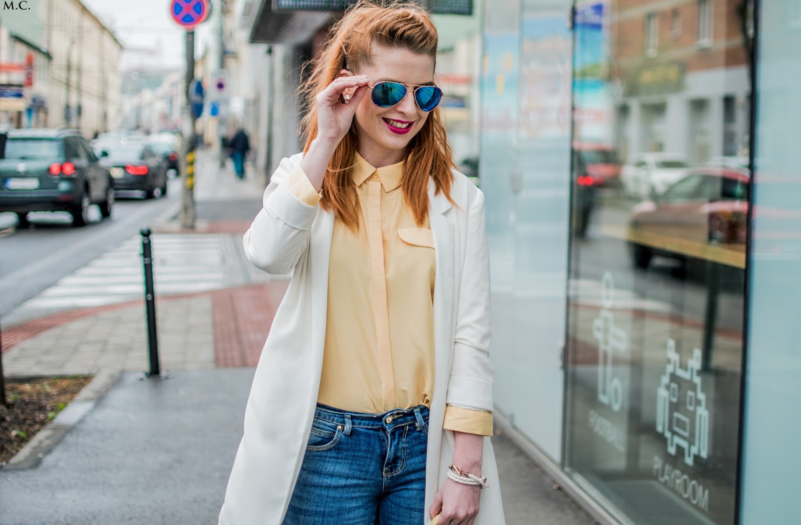 Napriek nepriaznivému počasiu vznikli tieto fotografie, ktoré sa mi veľmi páčia aj s mojimi rozlietanými a rozfúkanými vlasmi. V tento deň som mala na sebe džínsy, žltú košeľu a biele sako, ktoré skvele ladilo k mojím novým zaujímavo riešeným lodičkám. Tie nosím momentálne veľmi rada či už k nohaviciam alebo aj kratším sukniam. Nechýbala ani kabelka, ktorá si získava všade tam, kam ju vezmem, len pozitívne pochvaly. Z doplnkov som zvolila ďalší chválený kúsok – malé, ale za to pozornosť pútajúce náušnice z Lindexu, výrazný náramok a modré pilotky.