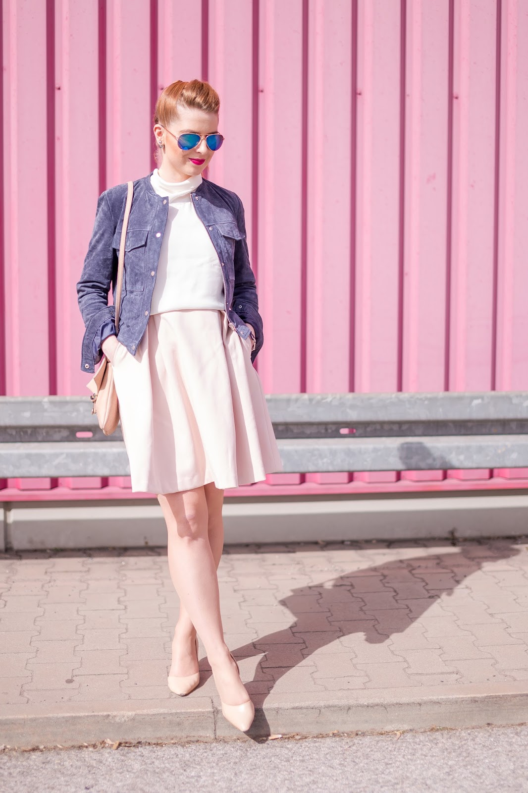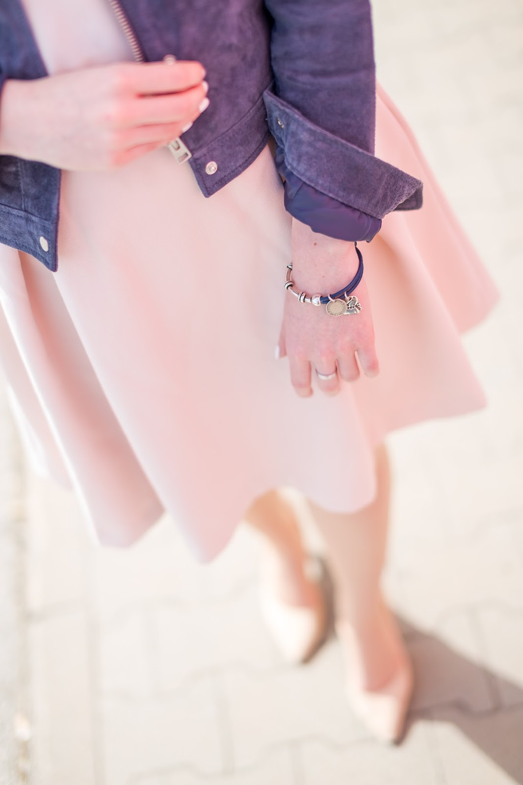 Outfit pozostáva z kúskov, ktoré som si odniesla z Blogger Shopping Run počas Hriešne dobrých nákupov v bratislavskom Auparku. Nádherné slabo ružové šaty a biely top z Reservedu a k tomu skvelá kožená bundička z Manga. Nechýba ani nový náramok Born in Barcelona, ktorý patrí do zbierky naj náramkov hneď z viacerých dôvodov. Jedným je, že mi dokonale sedí na ruke, čo sa nestáva často. Veľmi veľa náramkov mi totiž „cestuje“ po mojej chudej ruke hore dole. Navyše, sa skvele kombinuje rovnako ako ďalší nový doplnok – perličkové náušnice. K týmto najnovším kúskom som doladila staršie a osvedčené veci zo šatníka – obľúbené telové lodičky, telovú kabelku a pilotky. Momentálne ma kombinácia s ružovou či modrou farbou baví úplne najviac. Asi som sa nechala ovplyvniť aktuálnymi farbami pre tento rok – Rose quartz a Serenity.