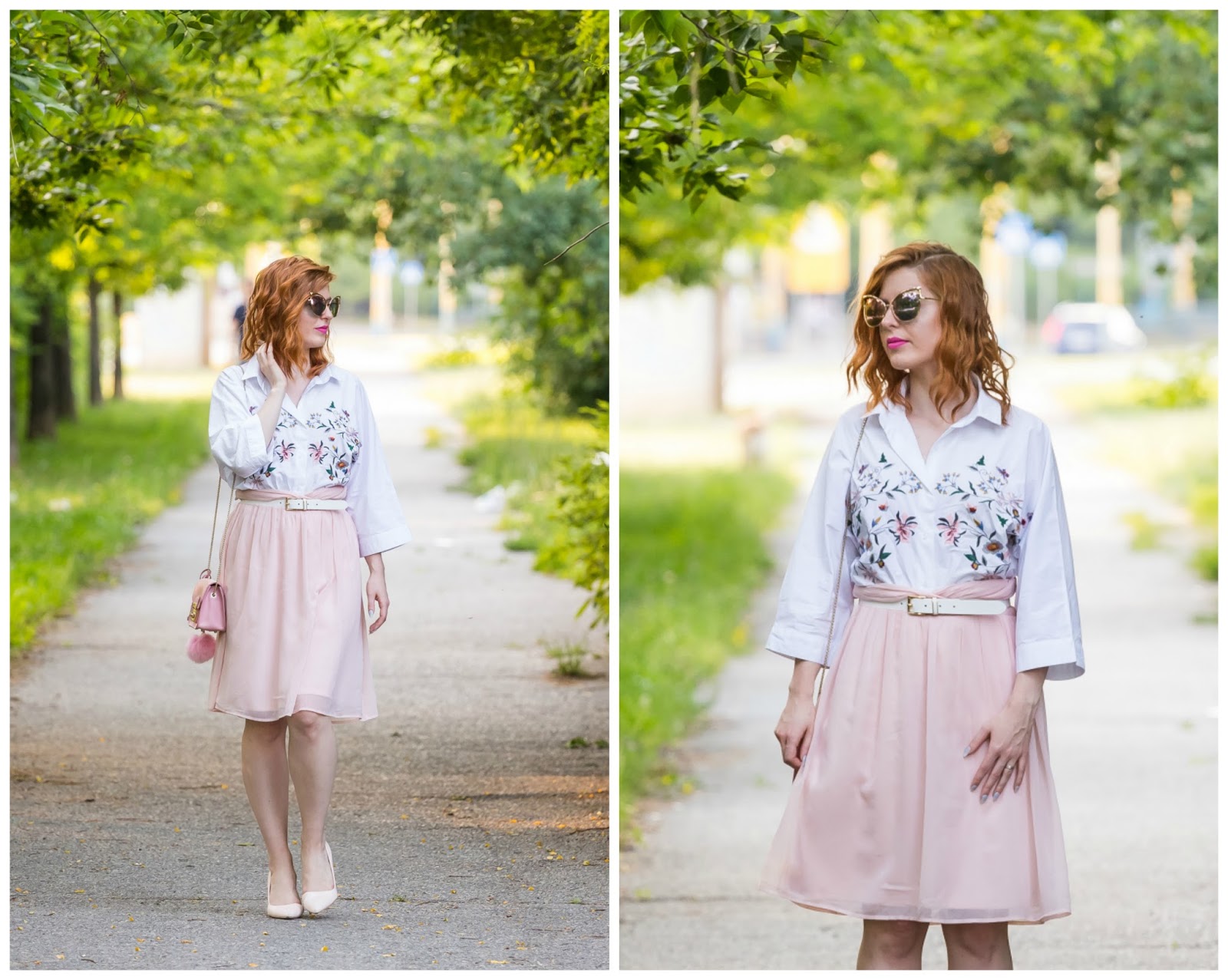 Ako top som zvolila košeľu, ktorú som vďaka dnešným teplotám rozopla o niekoľko gombíkov viac. Tento kúsok mám v šatníku od jesene a napriek tomu, že na blogu je len druhýkrát, nosím ho pomerne často. Nášivky na nej sú totiž mojou srdcovou a navyše v súčasnosti aj trendovou záležitosťou. Akonáhle mi košeľa ešte minulý rok prišla domov, vedela som, že ju musím skombinovať s púdrovo ružovou farbou. Tu je výsledok, v ktorom som sa dnes cítila výborne. Verím, že outfit zaujal i vás a možno aj trochu inšpiroval do týchto letných dní.