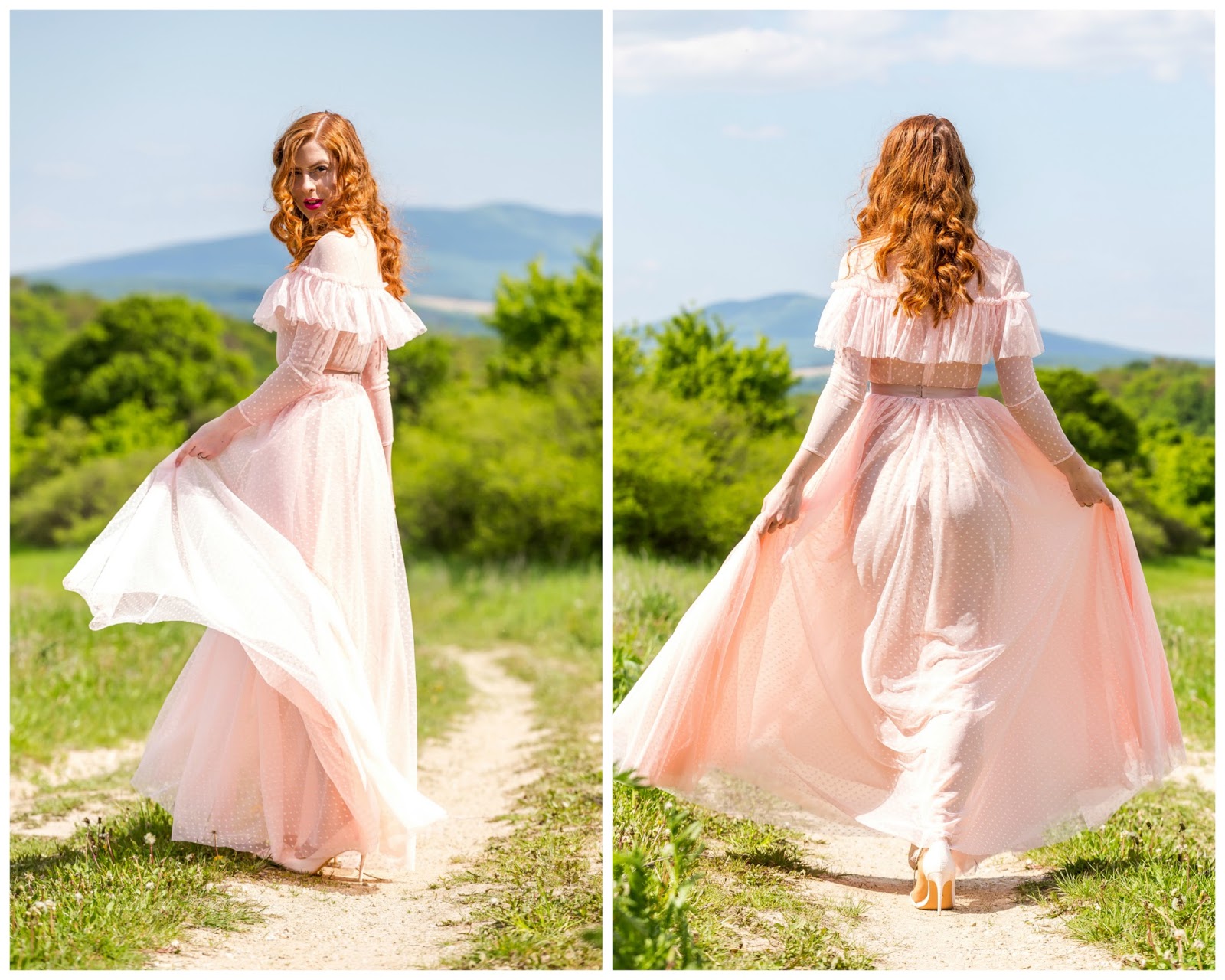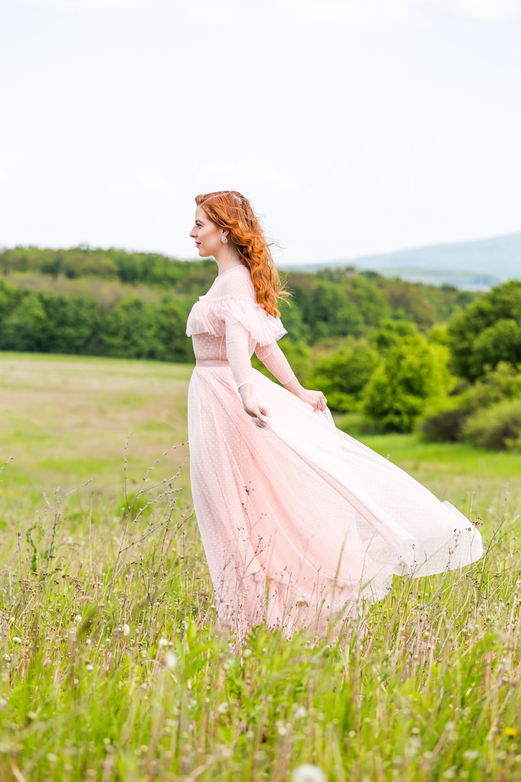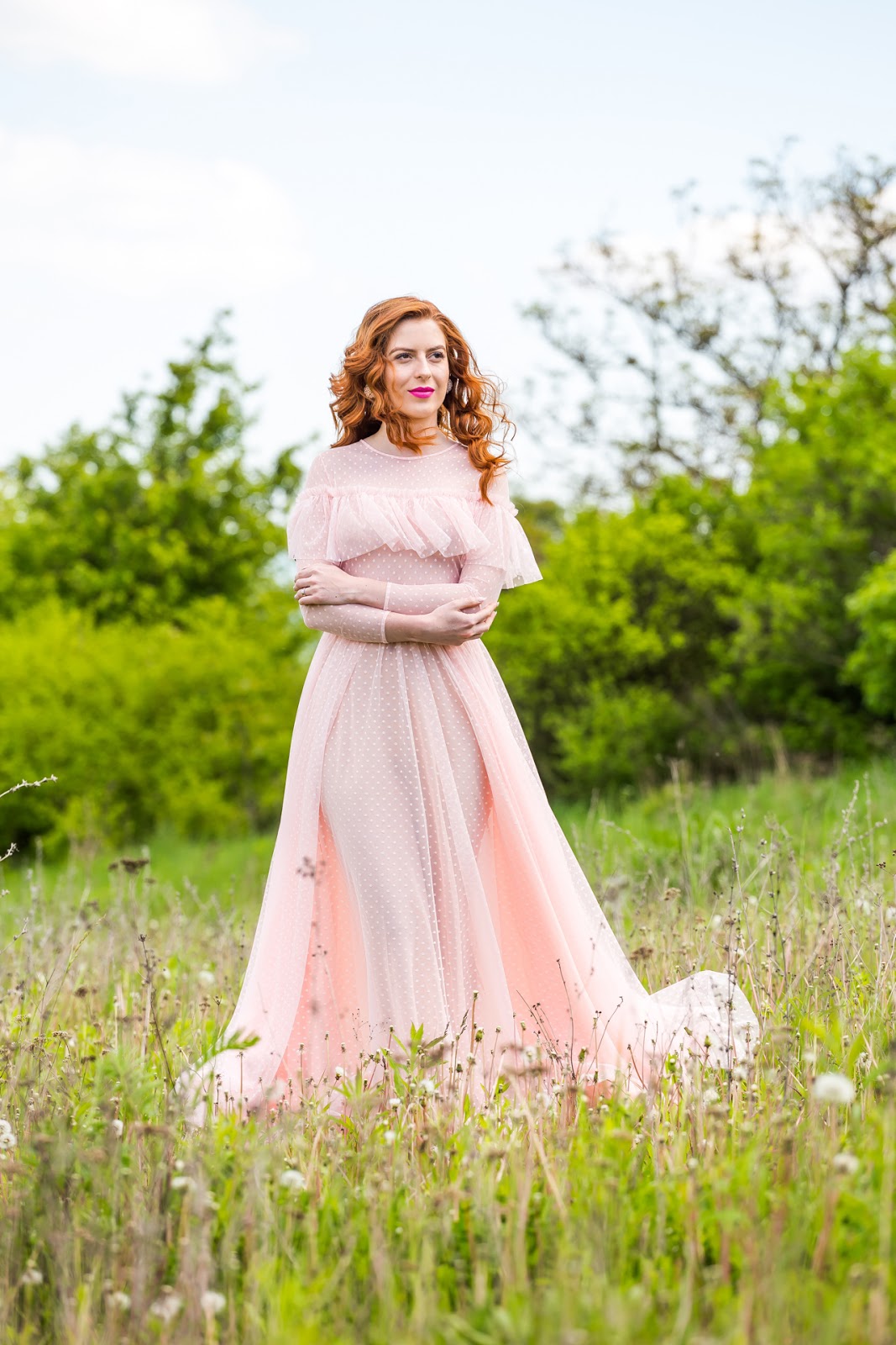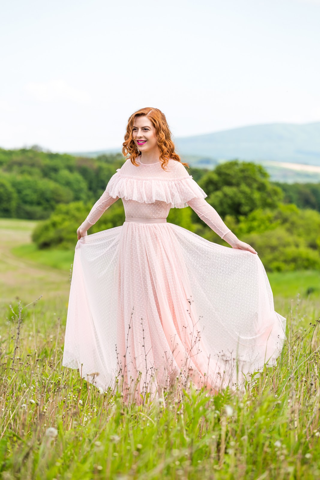 Ferko Mikloško to vymyslel priam dokonale. Ďakujem mu za tieto skvostné šaty ušité na mieru, expresne rýchlo a precízne do posledného detailu, keďže sadli ako uliate. Bolo pre mňa veľkým potešením mať popolnočné šaty z dielne tohto skvelého návrhára. Obzrieť ste si ich mohli v predchádzajúcom článku ale aj na Instagrame, kde si vyslúžili množstvo pochvál. Preto sme sa spolu s mojím manželom rozhodli, že vám ich opäť nafotíme. Avšak už nie na svadobnej hostine ale v inom prostredí – nádhernej zelenej lúke za Košicami, ktorá veľmi pekne korešponduje s ružovými bodkovanými šatami. Čo poviete na konečný výsledok? Verím, že sa bude páčiť.