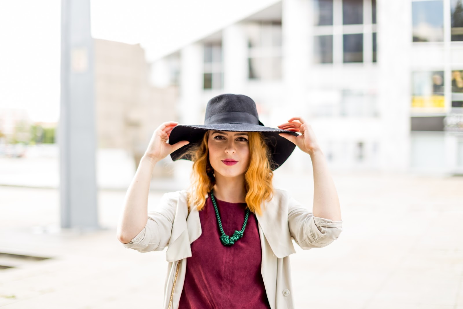 Burgundské F&Fkové šaty som skombinovala s tmavozeleným náhrdelníkom, ktorý pochádza z kolekcie Vyva – zo značky vytvorenej košickými žienkami. Čiernu farbu v outfite zastupujú lodičky z CCC a klobúk z H&M. Z tejto značky pochádza i kabátik, ktorý mám na sebe.