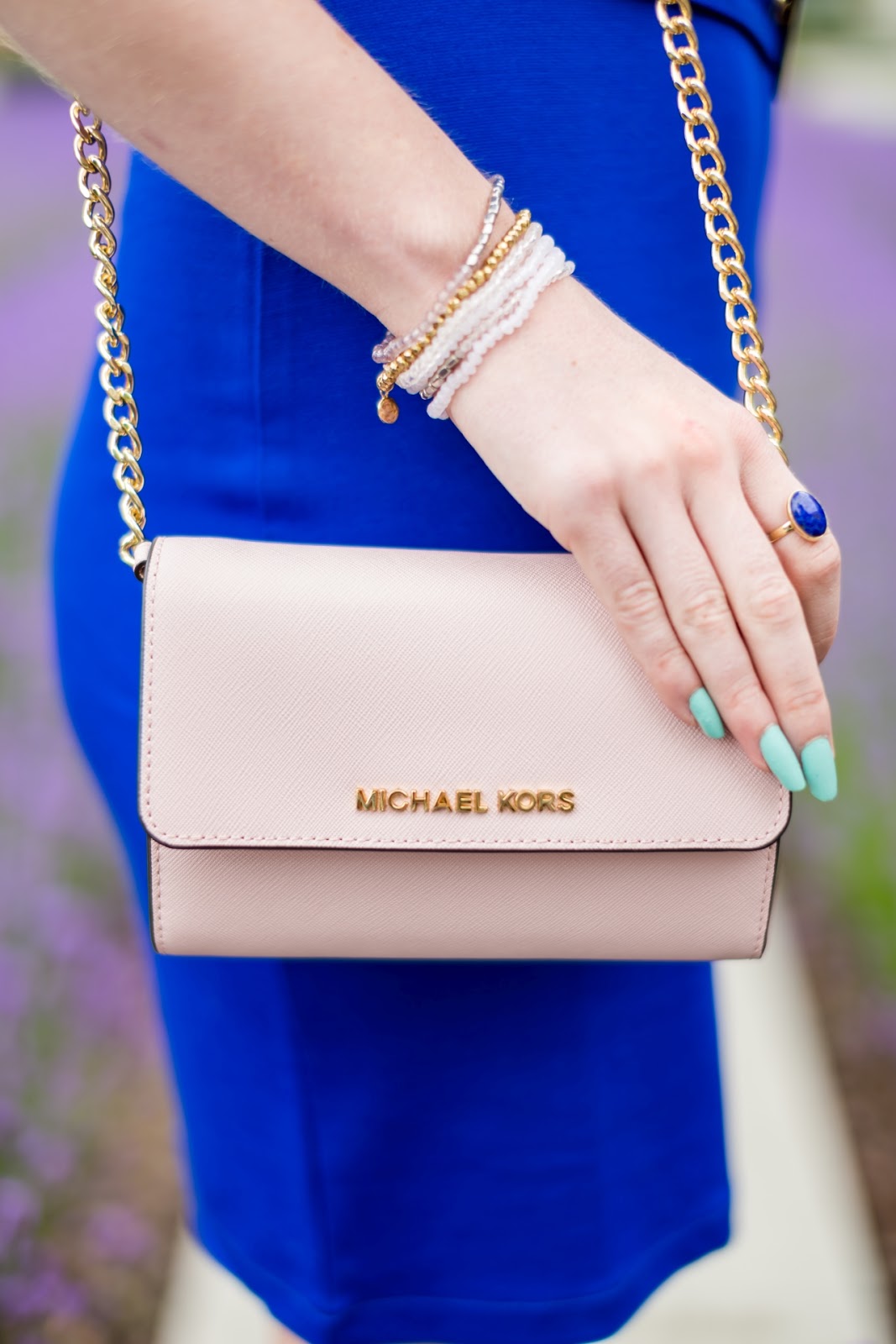 Omylom mi však určite nedorazili tieto modré šaty. Tiež som ich dlho vyčkávala a dočkala sa ich. Veľmi som sa na ne tešila. O to väčšiu radosť som mala, keď som ich skúšala. Sú odtiaľto a už na fotke mi padli do oka. Sú ideálnou voľbou hlavne na leto, keď nosíme čo najmenej vrstiev. Vďaka materiálu, strihu a ich praktickému rozopínaniu (ktoré ocenil najmä Dominik) mi v nich nie je vôbec teplo. Vždy, keď si tento modrý kúsok oblečiem, počúvam naň len samé pochvaly. Skombinovala som ich s telovými lodičkami. Tie sú podľa mňa rovnako univerzálnym kúskom ako čierne lodičky. Doplnila som k nim ešte staroružovú crossbody kabelku MK, do ktorej som sa úplne zamilovala. Nechýbajú ani ďalšie doplnky – náramky z Lindexu a prsteň s náušnicami od šikovných Košičanov z KLIMI.