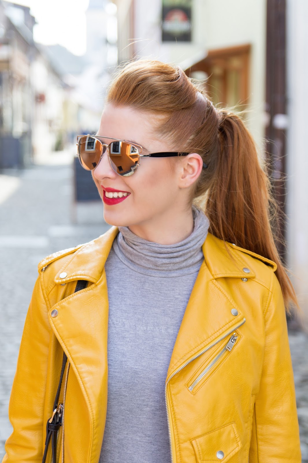 Rovnako ako sú rodinné víkendy v Žiline veselé a optimistické, tak aj z dnešných fotografií, dúfam, vyžaruje pozitivita. Minimálne vďaka obľúbenej žltej bunde. Na ňu od minulého roka nedám dopustiť a pravidelne ju s radosťou nosím. Na blogu ste ju naposledy mohli vidieť v kombinácií s modrou, dnes sa vyníma pri čiernej a sivej. Zvolila som k nej šaty, z ktorých som v tomto outfite za pomoci opasku vytvorila sukňu s čipkovanou vrchnou časťou. Z doplnkom som si vybrala okuliare so zrkadlovými sklami, kabelku s výrazným zlatým detailom korešpondujúcim s opaskovou prackou a členkové čižmy. Samozrejme, nezabudla som ani v tomto prípade na výrazný červený rúž.