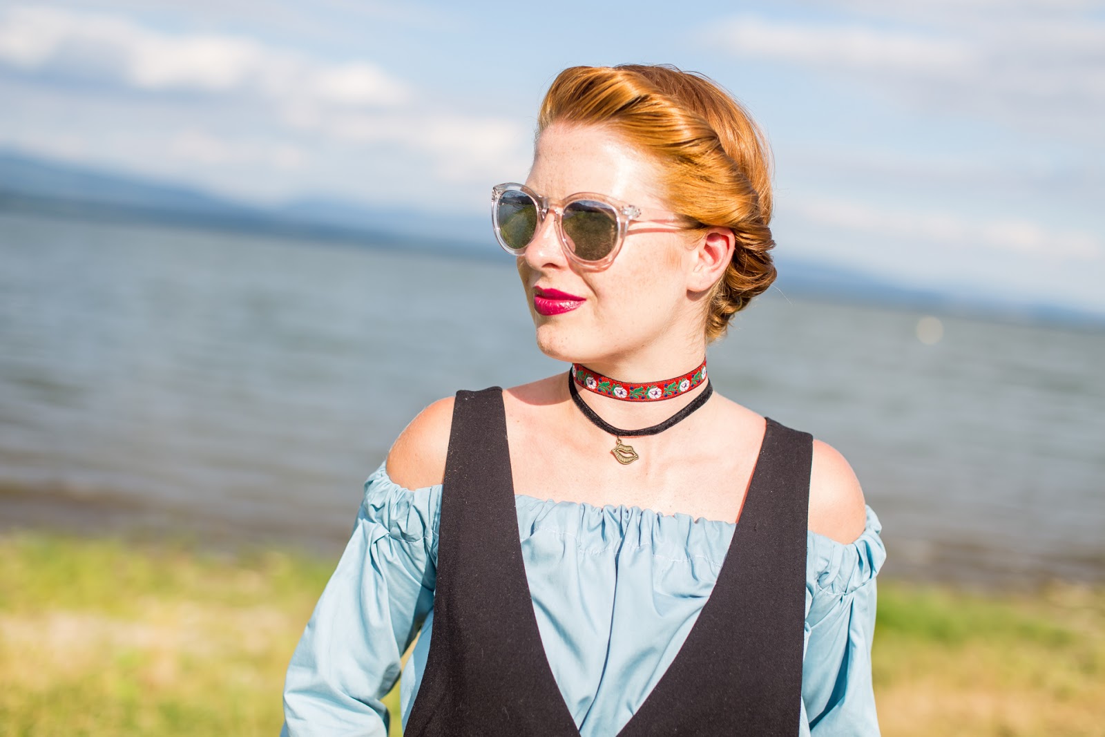 šaty – H&M // off shoulder top – RENEWALS by NOSENE // šľapky, okuliare – F&F // choker s príveskom – ALIEXPRESS // choker s ľudovým motívom – DIY so ZOOTom