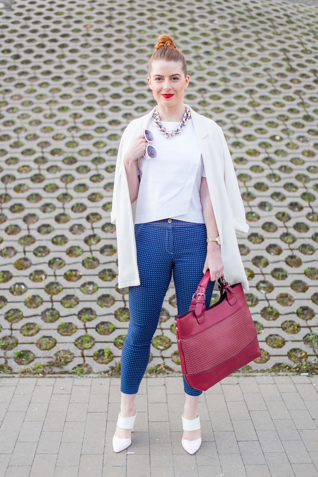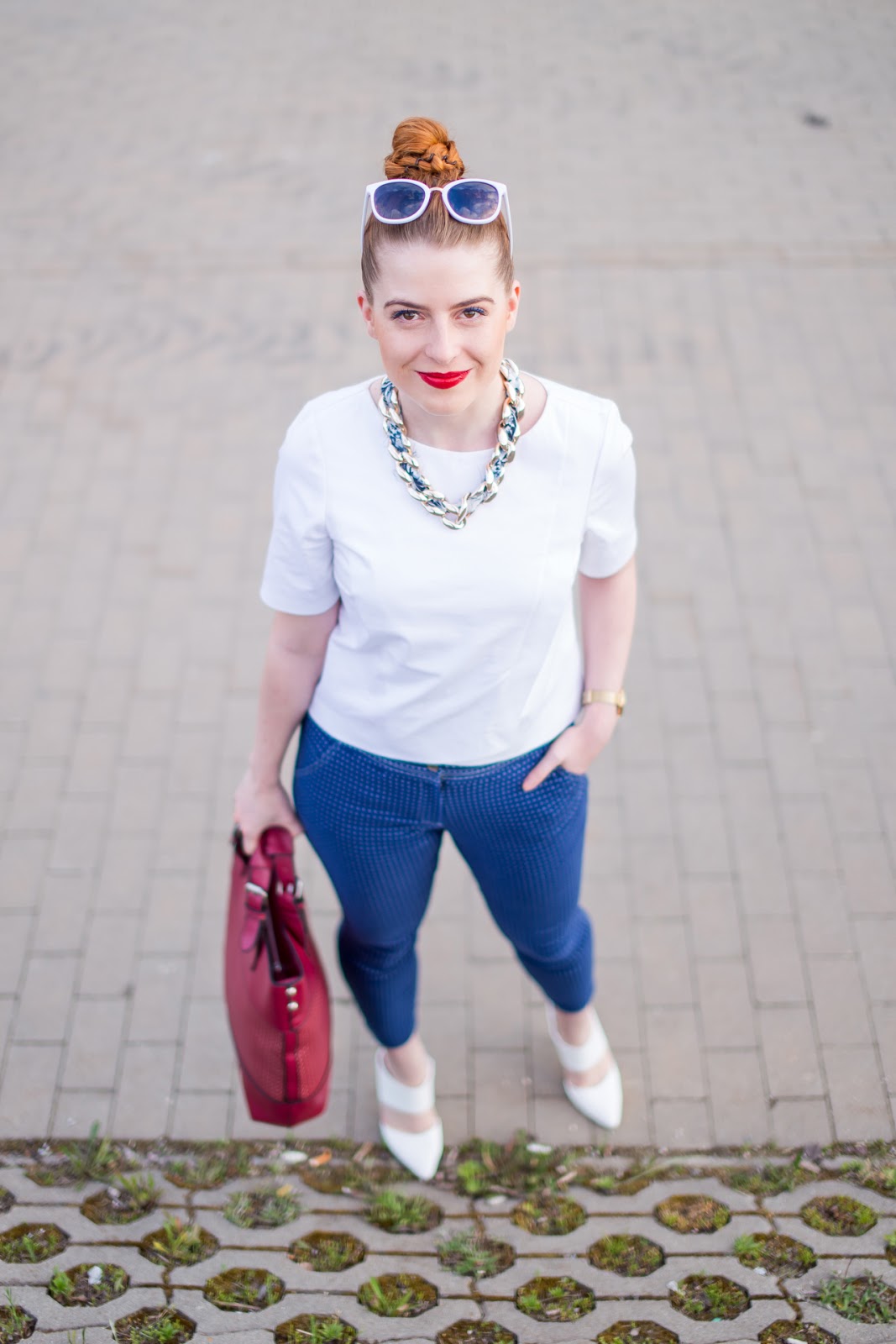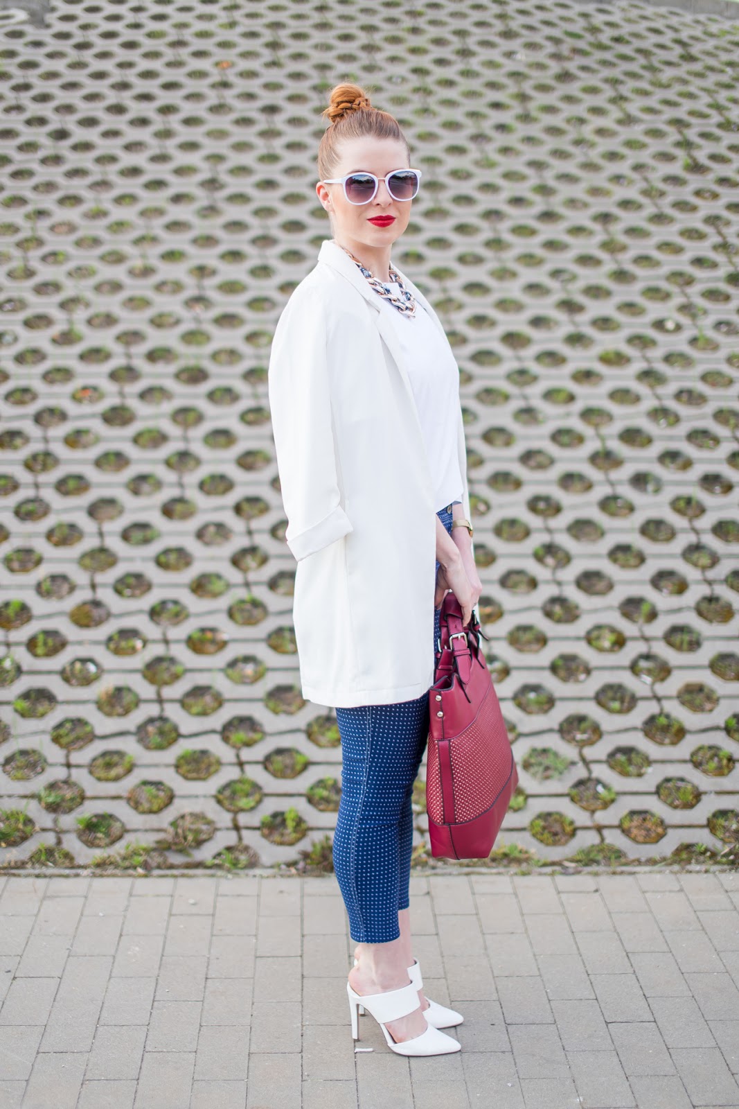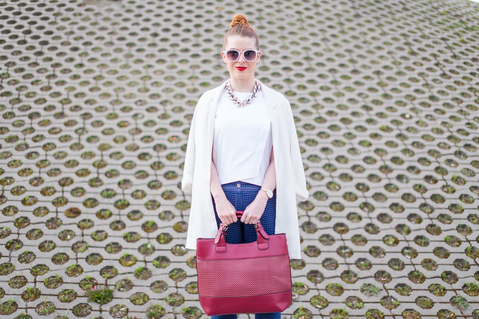 K celému outfitu som doladila veľkú a priestrannú bordovú kabelku so zaujímavou štruktúrou, veľký náhrdelník od Fera Mikloška, biele dlhšie sako, biele asymetrické lodičky, zlaté hodinky a výrazné biele okuliare. Musím sa priznať, že modrá je moja obľúbená a veľmi rada ju kombinujem práve s bielou či bordovou podobne ako v dnešnom outfite.