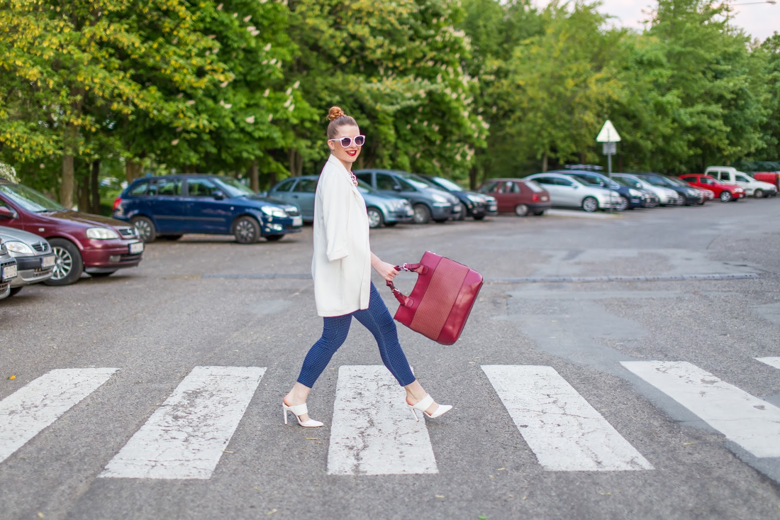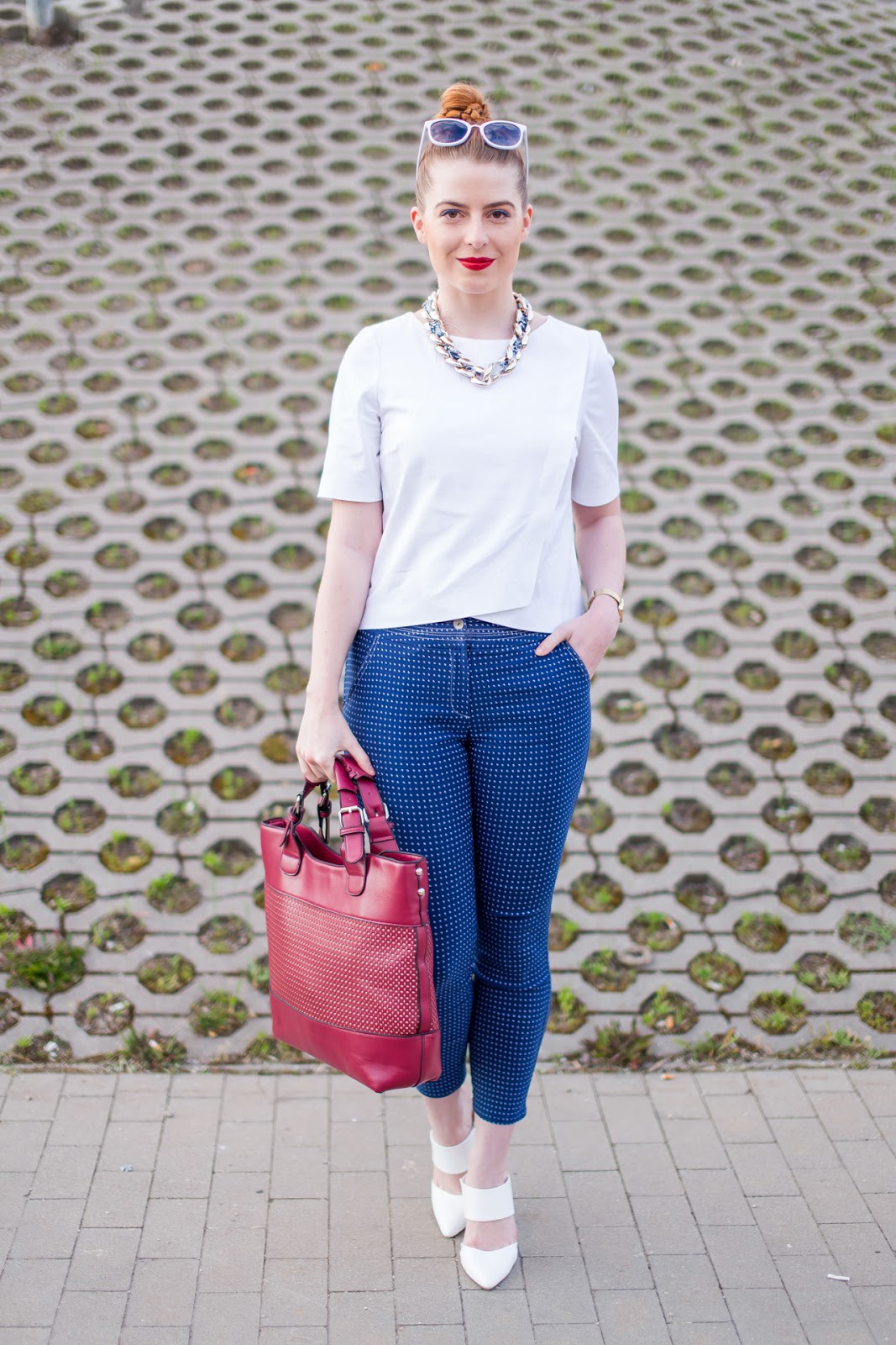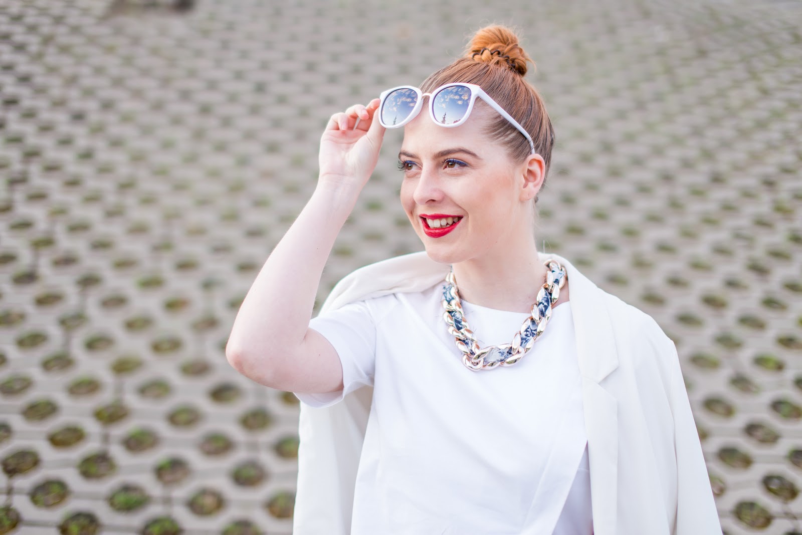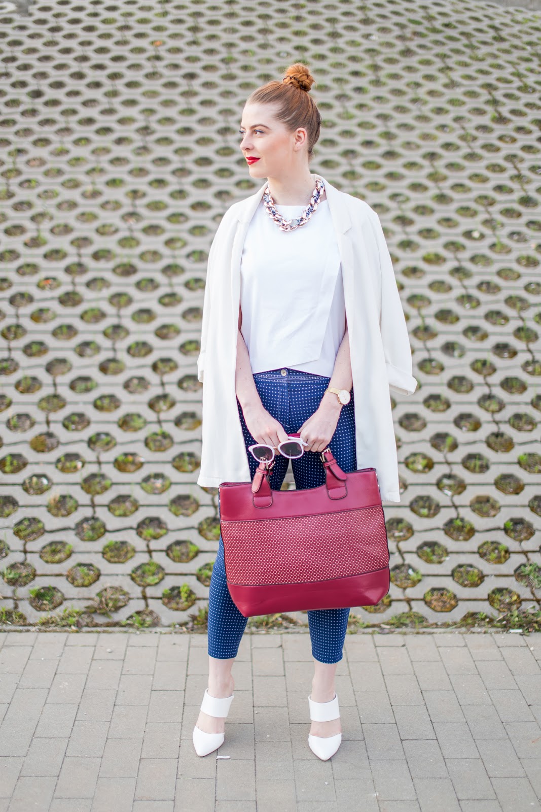 K celému outfitu som doladila veľkú a priestrannú bordovú kabelku so zaujímavou štruktúrou, veľký náhrdelník od Fera Mikloška, biele dlhšie sako, biele asymetrické lodičky, zlaté hodinky a výrazné biele okuliare. Musím sa priznať, že modrá je moja obľúbená a veľmi rada ju kombinujem práve s bielou či bordovou podobne ako v dnešnom outfite.