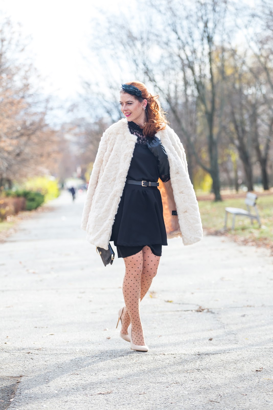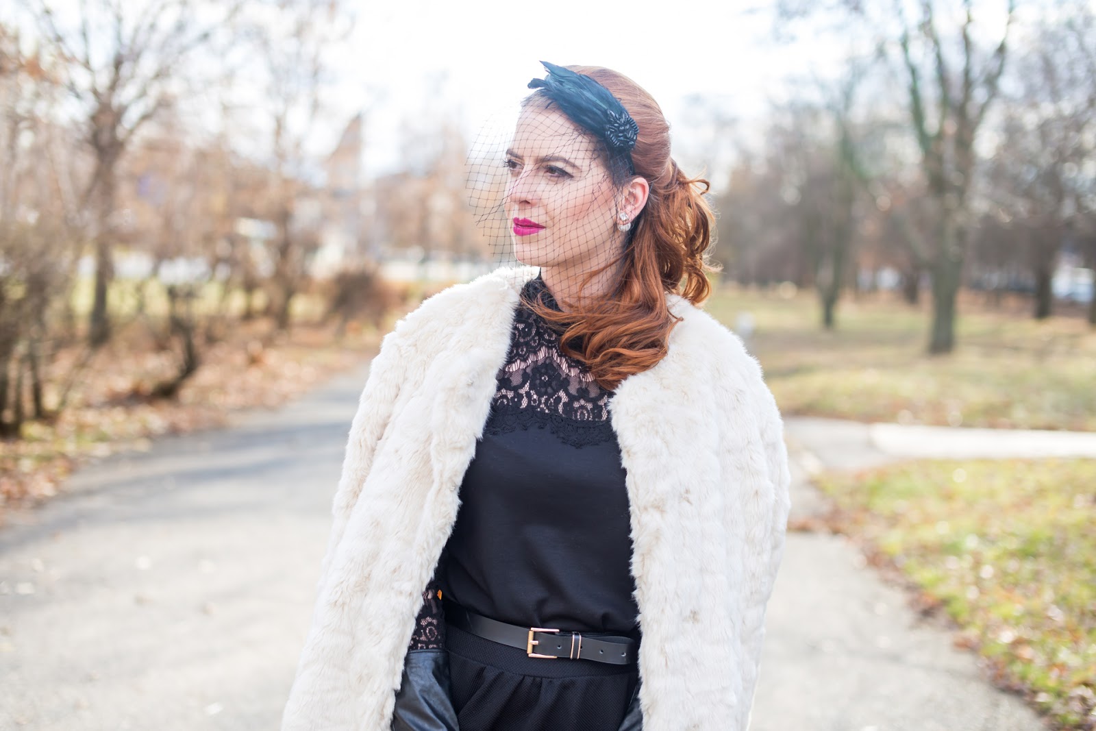 OOTD 1: top, náušnice, fascinátor, kabát, kabelka – LINDEX // sukňa – STRADIVARIUS // opasok – H&M // lodičky – TOPANKOVO // rukavice – ORSAY // pančušky – BEPON x PETRA TOTH