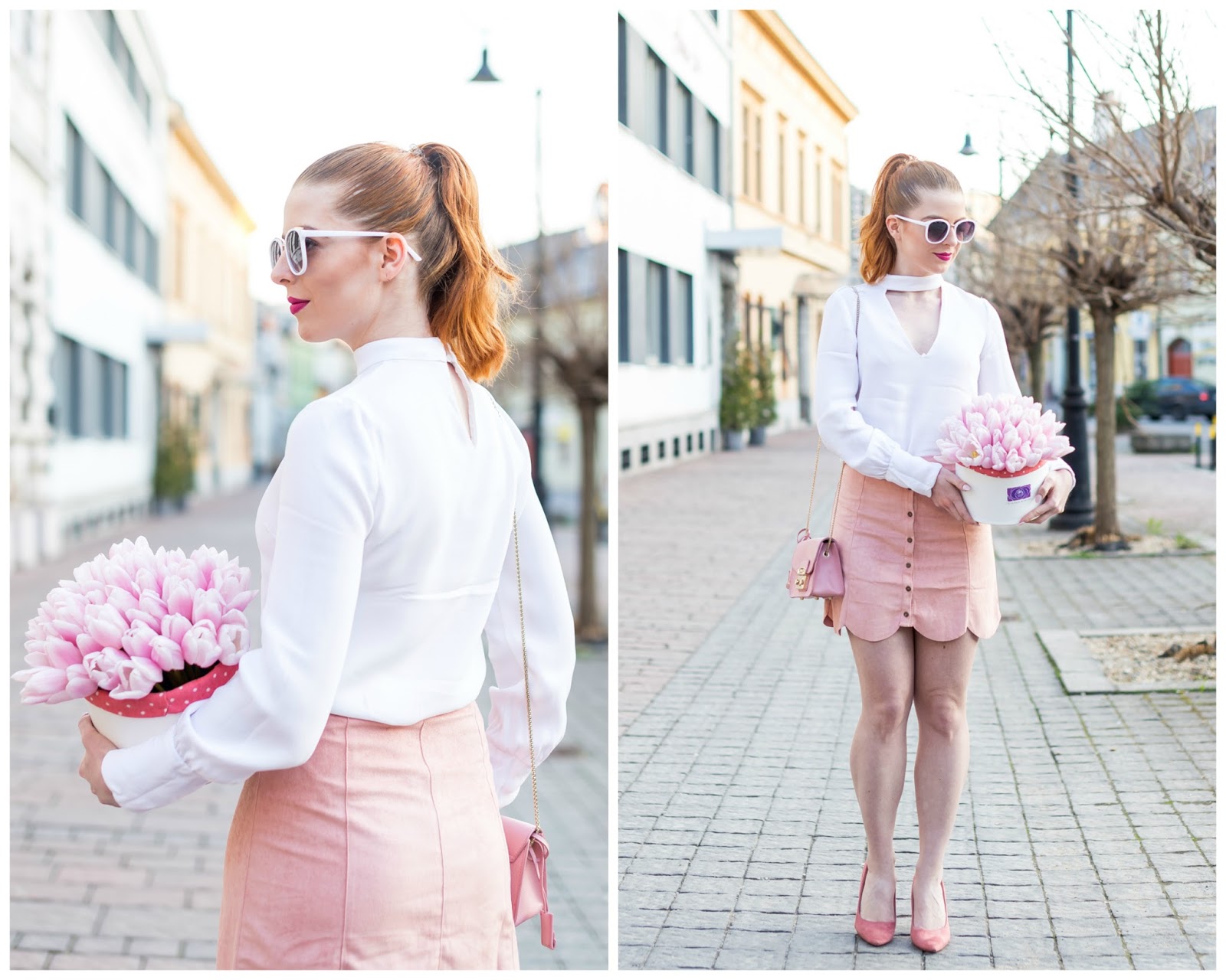 Občas sa smejem, že verím aj v tulipány, pretože vždy, keď ich mám doma, sú moje dni optimistické, radostné a nádherné. Sú pre mňa stelesnením pozitívnej energie a veľkej radosti. S tulipánmi si ma zaručene získate, rozveselíte ma a vyžehlíte všetko. Myslím, že o jednom z pozitívnych účinkov tohto kvetu na mňa vedeli aj v Galérií Kvetín. Neskutočne ma prekvapili, keď mi poslali ich novinku – flower box plný tulipánov. Dokonca boli farebne zhodné s tými, ktoré máme na svadobných oznámeniach. Preto som sa hneď na druhý deň rozhodla nafotiť kvetinovú krabicu plnú čerstvých tulipánov a to rovno v outfitovom poste. Zladila som sa pekne do jej farieb – ružovej a bielej a prevetrala som i svoju novú sukňu. Čo hovoríte na celú kombináciu? Musím sa priznať, že mňa kombinácia s púdrovo ružovou tento rok neskutočne baví. Ale to ste si pravdepodobne už všimli.