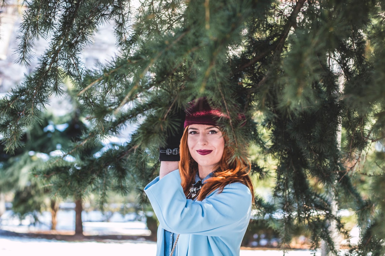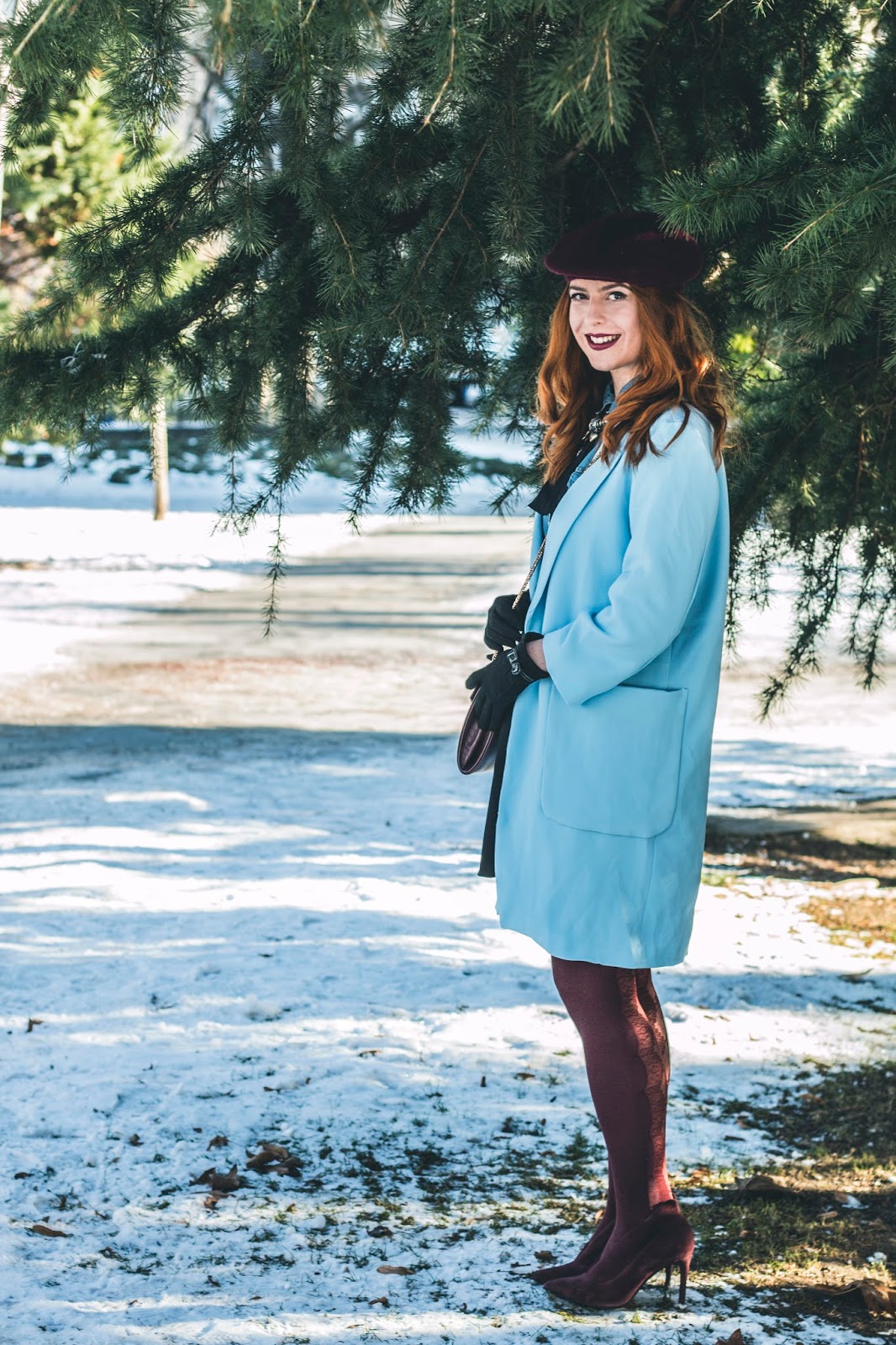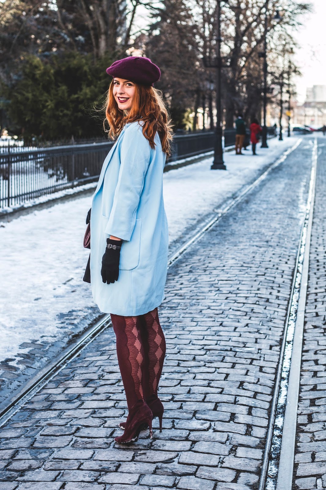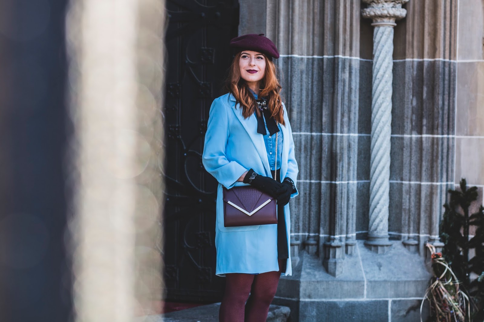 Keď sme fotili so šikovnou Veronikou Selepkovou tento outfit, budík som ani len nepotrebovala. Zobudila som sa o ôsmej (čo je na voľné dni pre mňa skorá hodina:D), všetko pekne postíhala a o dvanástej som bola šťastná, čo všetko som postíhala. S radosťou som si vykračovala po košickej Hlavnej v novom kabátiku. Tešila som sa nielen z produktívneho dopoludnia, ale aj z farebnej kombinácie. Už dlho som mala chuť na seba zobrať belasú s bordovou. Hneď, ako som v zľavách našla túto baretku, bolo rozhodnuté. Doladila som k nej silónky, topánky, náhrdelník a tiež kabelku. Voľba ostatných kúskov už prišla sama na čele s kabátom a novou džínsovou košeľou. Myslím, že centrum Košíc dokonale dotvorilo dnešný outfit.