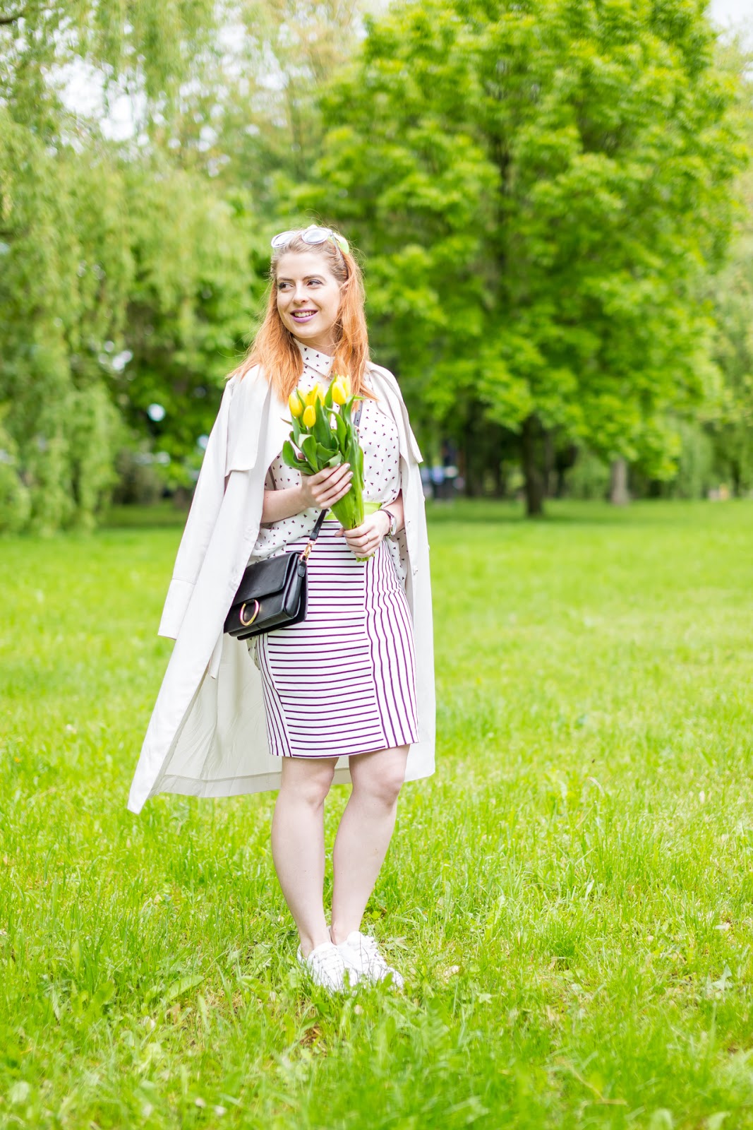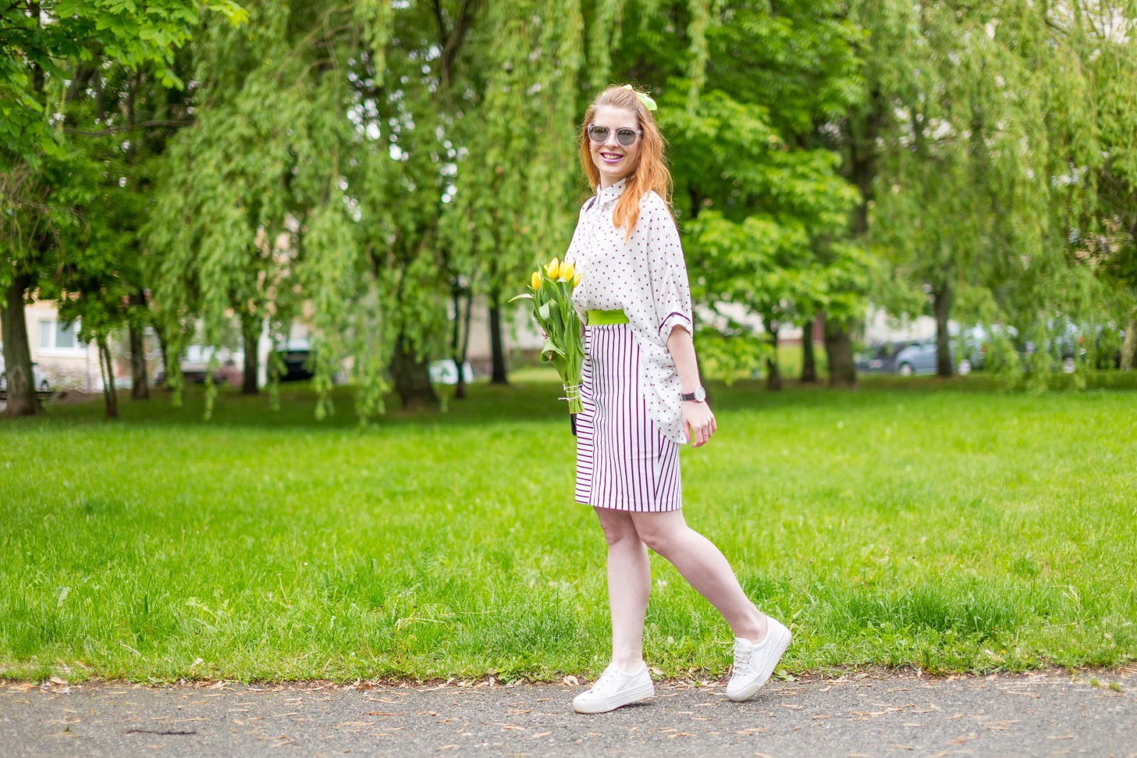 mušková košeľa – ZOOT // sukňa – BEPON // tenisky – ASOS // kabelka – LINDEX // jarník – H&M // náušnice – KLENOTY AURUM // okuliare – F&F // hodinky – CHEAPO (ZOOT)