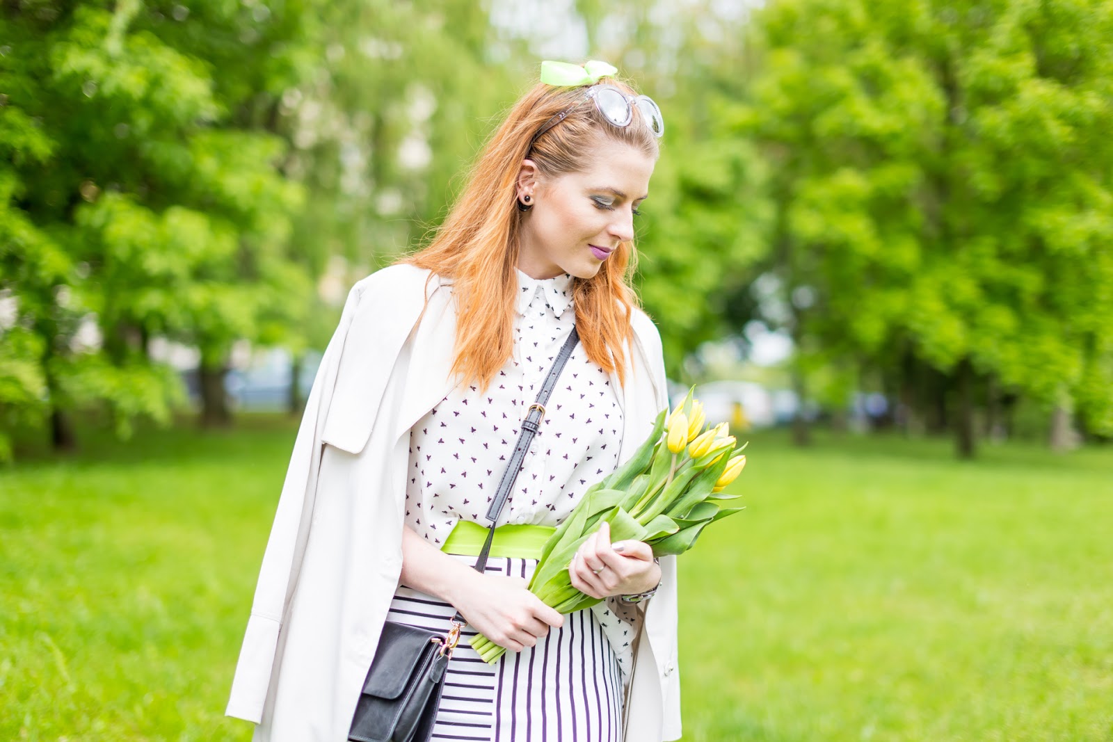 Dnešný outfit vznikol dávno – pradávno. Vonku pomaly ale isto začalo pršať a neskutočne fúkalo, čo sa odrazilo na mojom „messy“ účese. Jedným z hlavných prvkov dnešného looku je mušková košeľa. Odvtedy, čo ste ju videli v telke a v Nákupných maniačkach, dostala pomenovanie ako bodkovaná či srdiečková. No, skutočne sú to mušky, tento raz skombinované s pásikmi. Od okamihu, keď som ju uvidela v Alchymi kolekcií na Zoote, som vedela, že ju raz skombinujem s uzkou vzorovanou sukňou. Raz za čas ma jednoducho baví kombinovať vzory. Vždy sa pri nich držím pravidla, že aspoň jedna farba sa musí na oboch kúskoch opakovať. Pri čiernobielej kombinácií to však vôbec nebol problém.