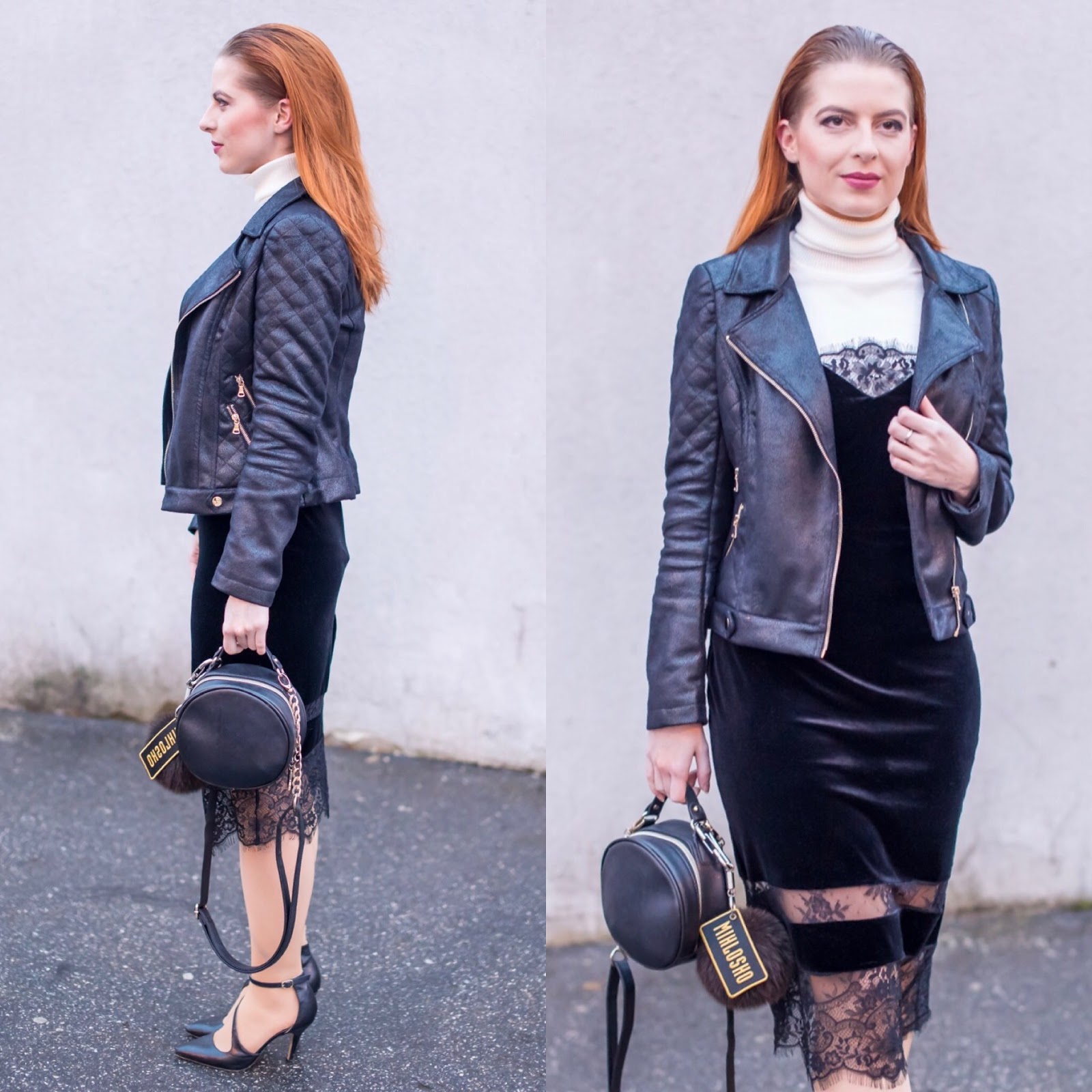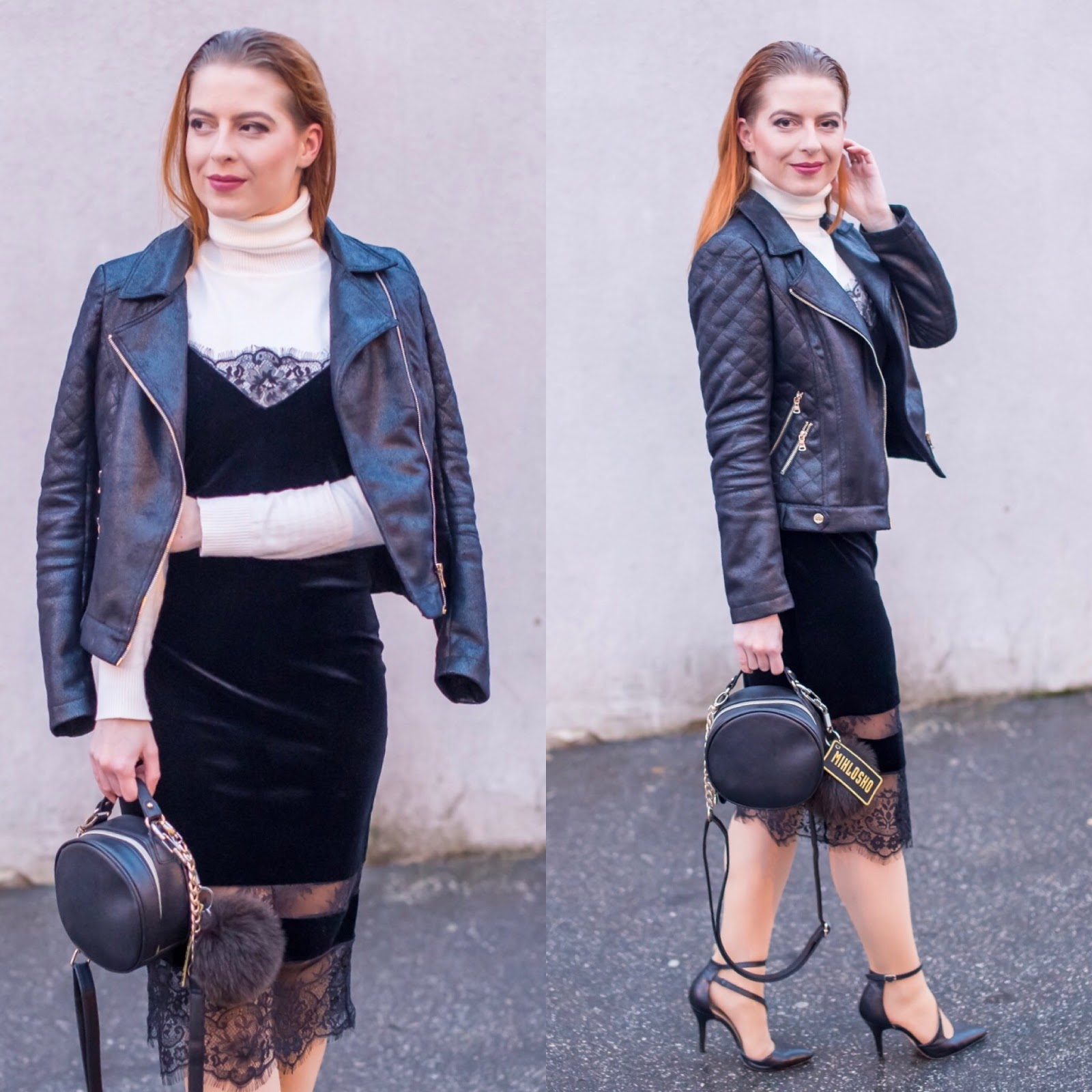 Musím sa priznať, že mne sa celý outfit veľmi páči a cítim sa v ňom fantasticky. Šaty robia skvelú postavu a čipka vytvára zaujímavý detail, ktorý neujde žiadnemu oku. Dnešné fotky som si preto zamilovala. So všetkým, čo je na nich. Od kabelky, bundy cez mokrý účes až po šaty. A áno, aj ZAMAT.