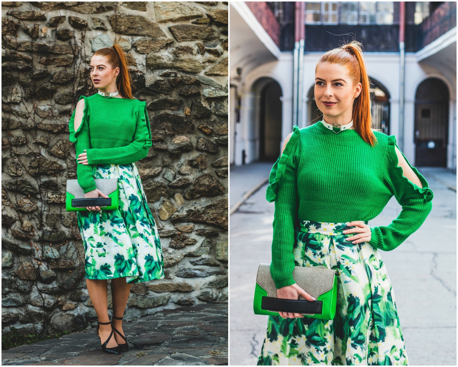 Nielen z týchto dôvodov dostala u mňa zelená zelenú. Dôležitým aspektom bol aj fakt, že tento odtieň sa mi veľmi páči v spojení s farbou mojich vlasov. Preto som k novému zelenému svetríku s odhalenými ramenami zvolila rozkvitnutú sukňu v midi dĺžke. Aby nebolo zelenej málo, pridala som aj kabelku v podobnom odtieni s čierno – bielymi detailmi. Z doplnkov som siahla po bielom srdiečkovom „obojku“ a čiernych lodičkách.